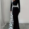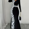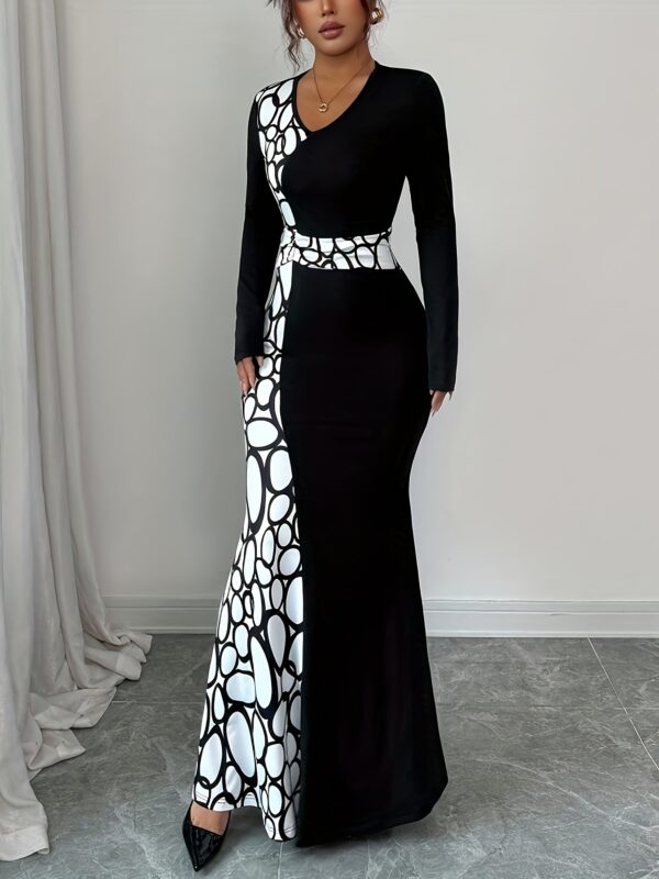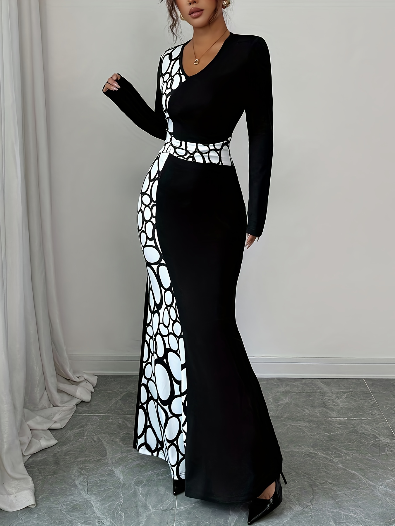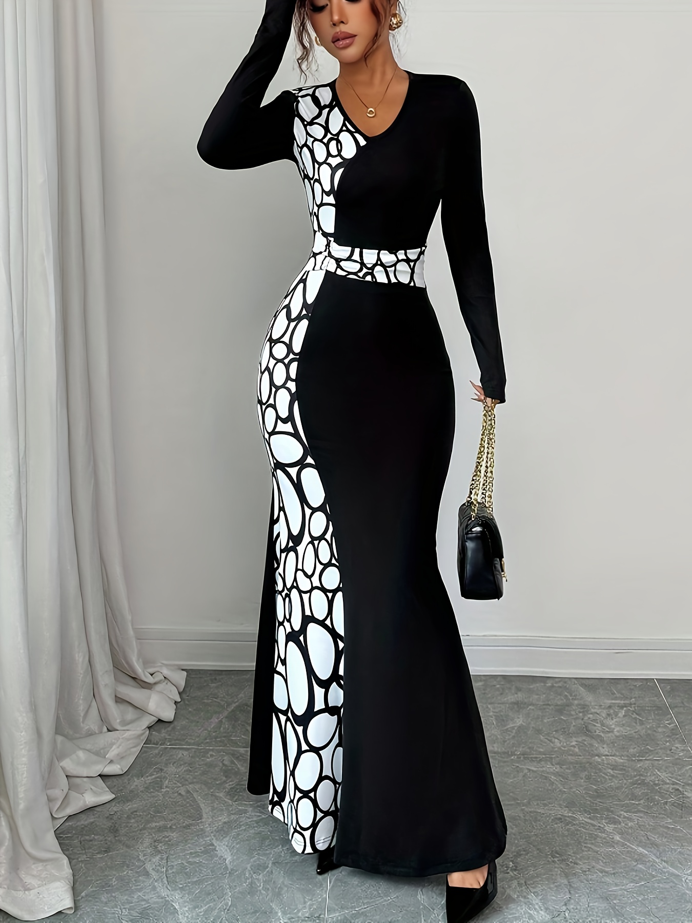 فستان سهرة نسائي أنيق بقصة V وطبعة هندسية فاخرة – مثالي لمناسبات الخريف والشتاء