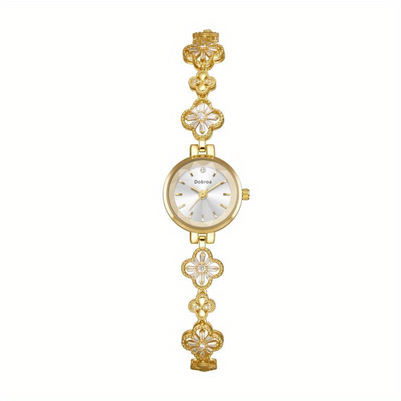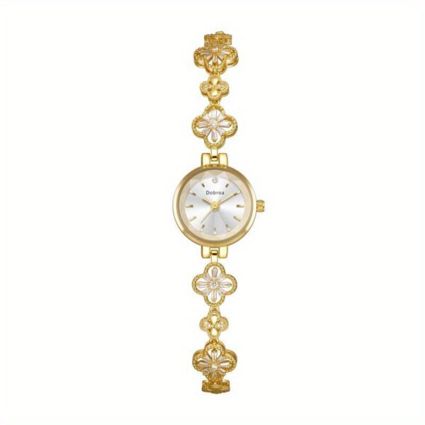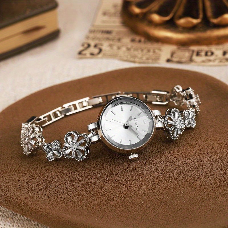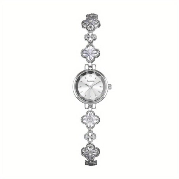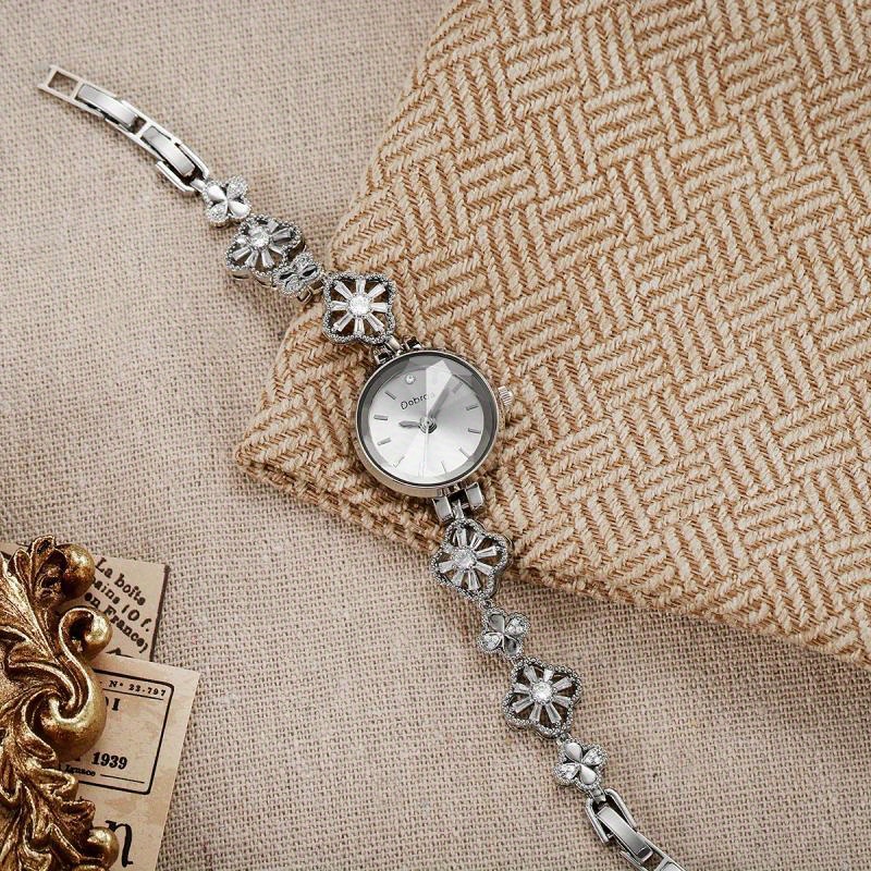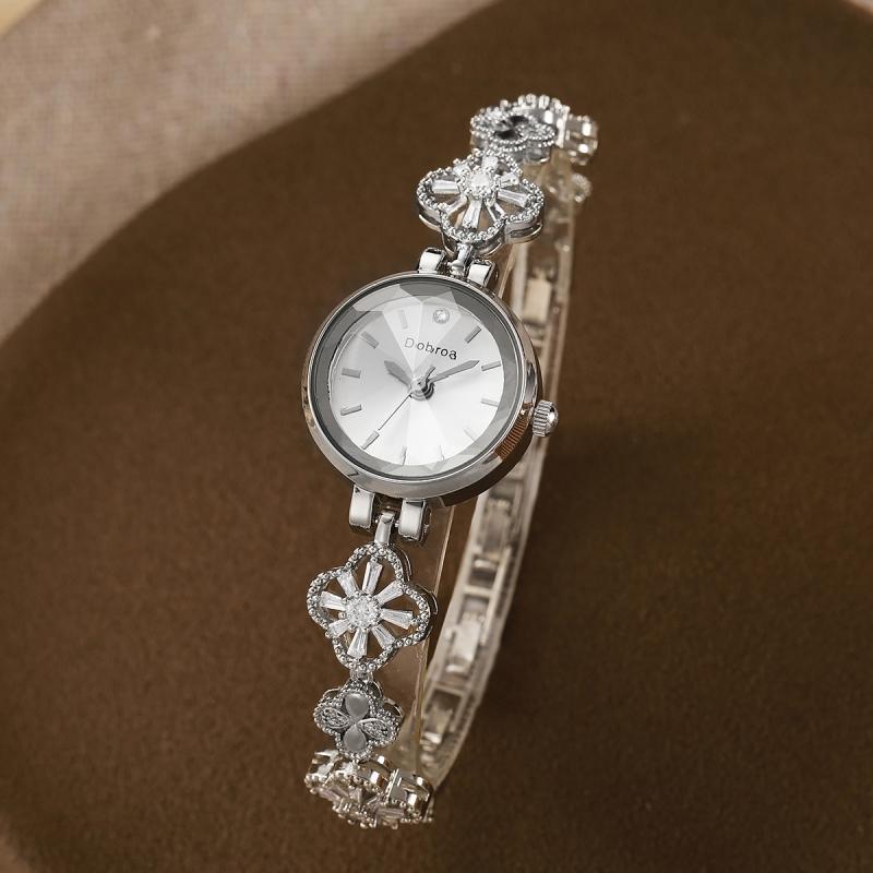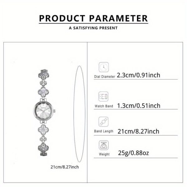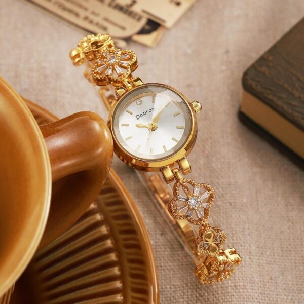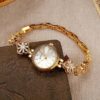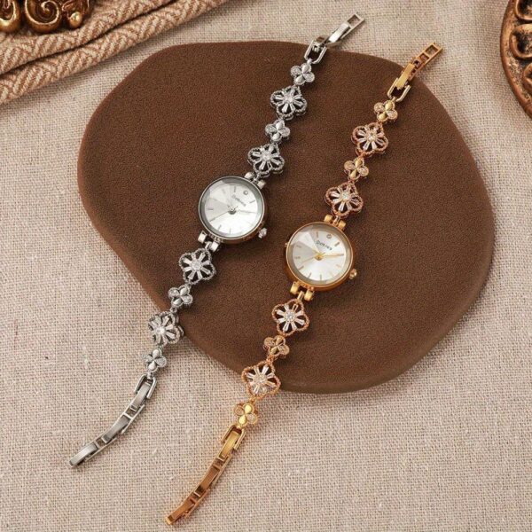 - تصميم ساحر وفريد: تتميز الساعة بهيكل أنيق من سبيكة معدنية عالية الجودة ينسجم تمامًا مع سوارها النحاسي الآسر، المزخرف بتصميم زهور دقيق وأحجار براقة تضفي عليها لمسة من الفخامة المتلألئة.