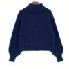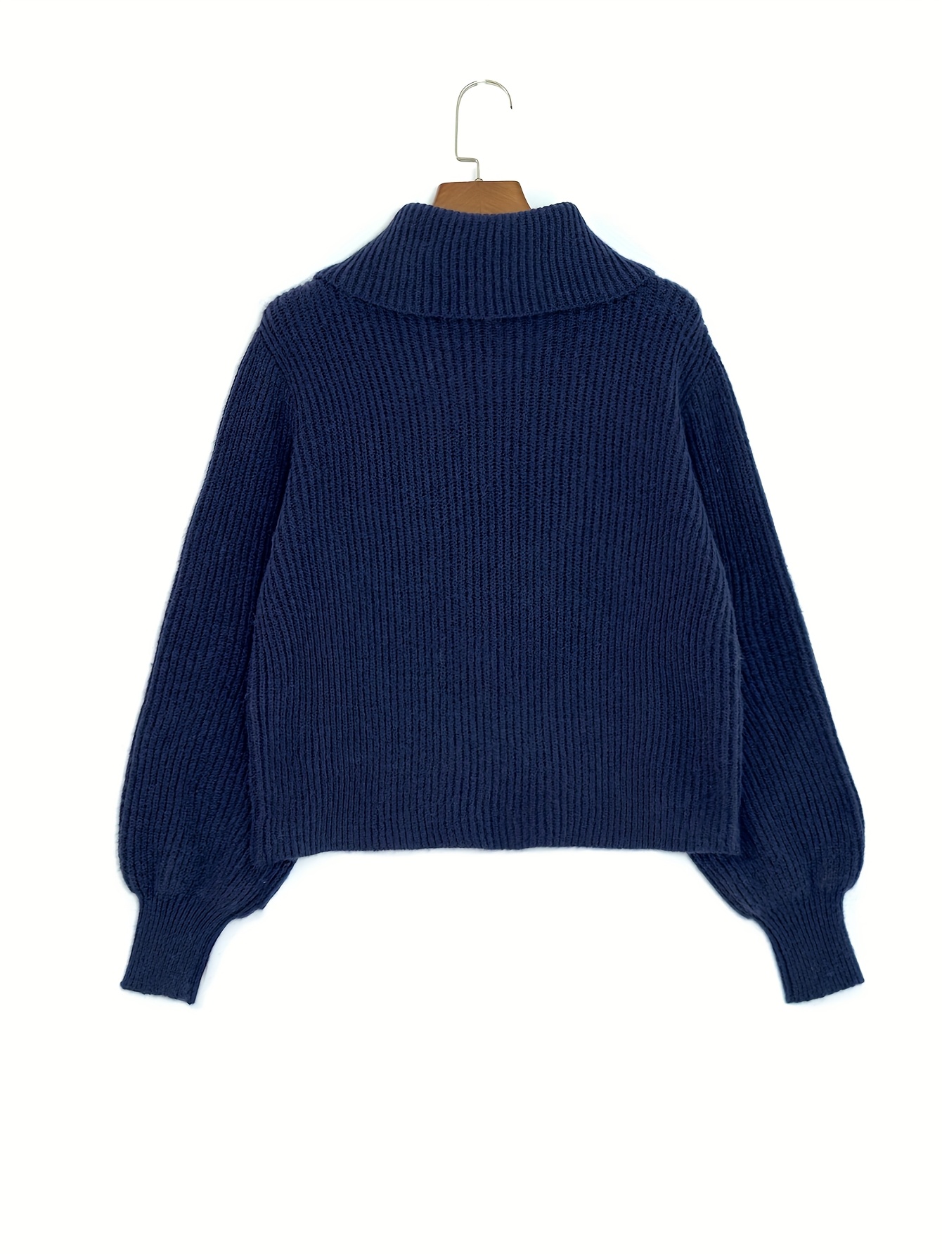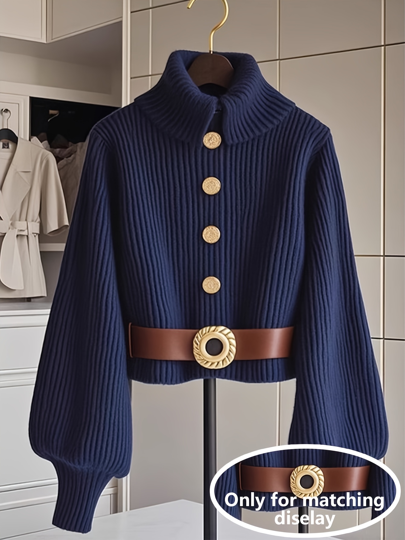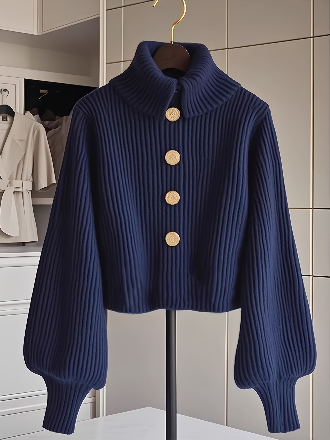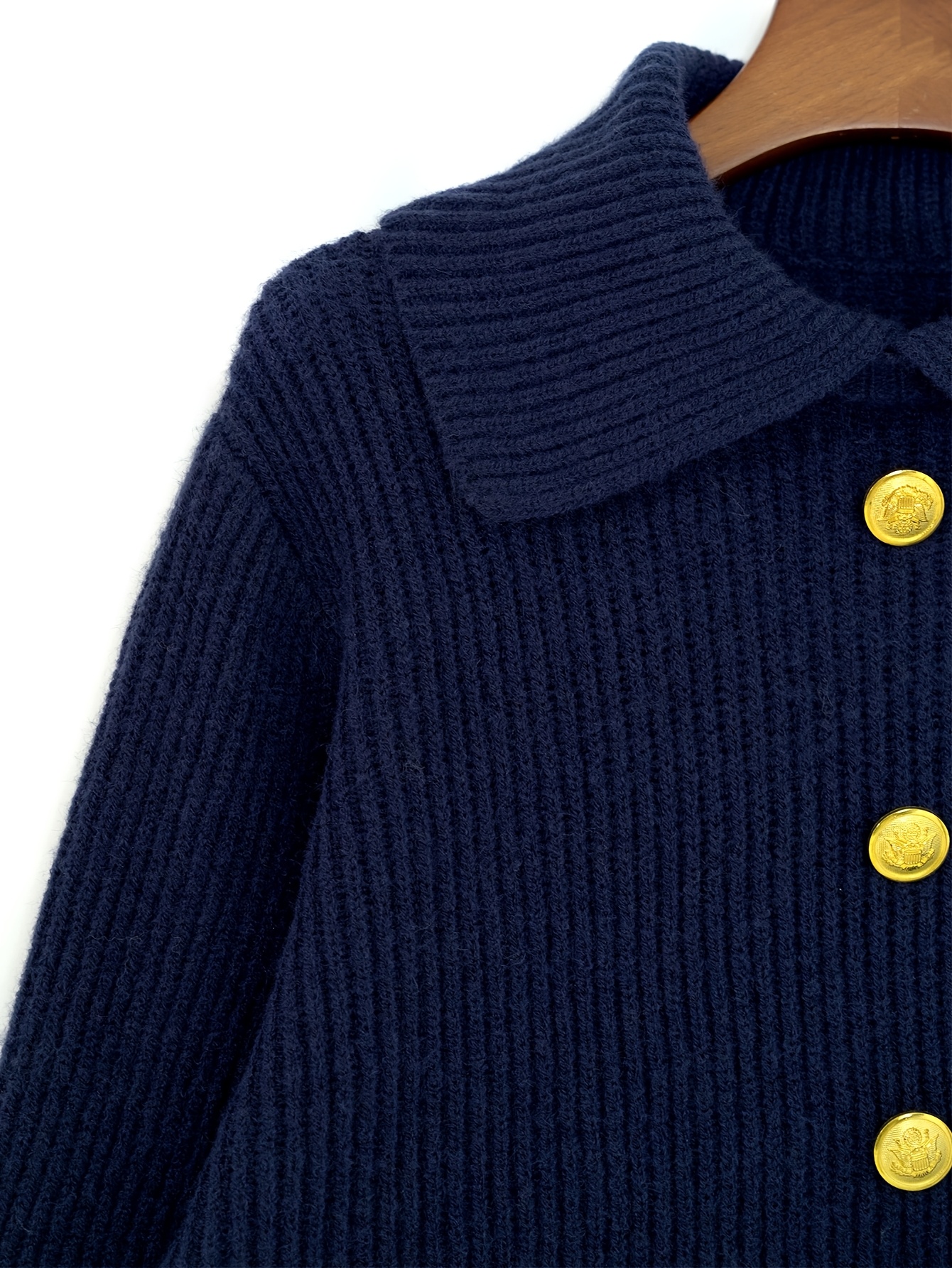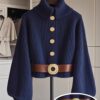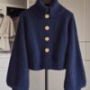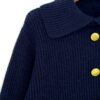 - تصميم بليزر عصري: يتميز بياقة بليزر أنيقة وتفاصيل أزرار وهمية تضفي لمسة من الرقي، بالإضافة إلى نسيج محبوك بلون أزرق سادة كلاسيكي.