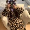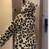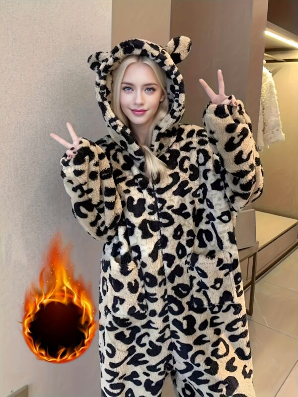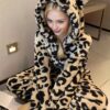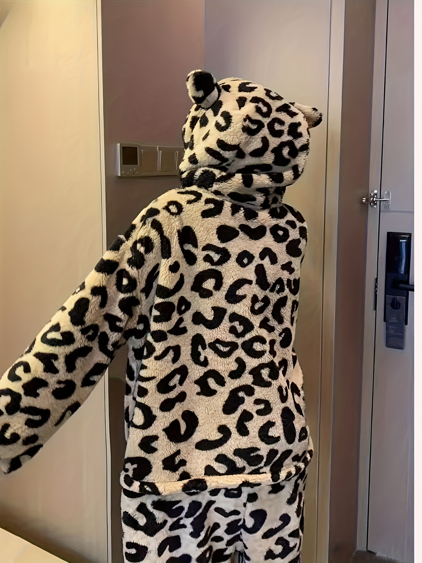 - تصميم فريد وعصري: بيجامة بقطعة واحدة وقلنسوة، تتميز بنقشة الليوبارد الجريئة باللونين الأسود والأبيض، لتمنحكِ إطلالة أنيقة ومرحة في آن واحد. مثالية لتبقى دافئة وعصرية!