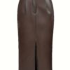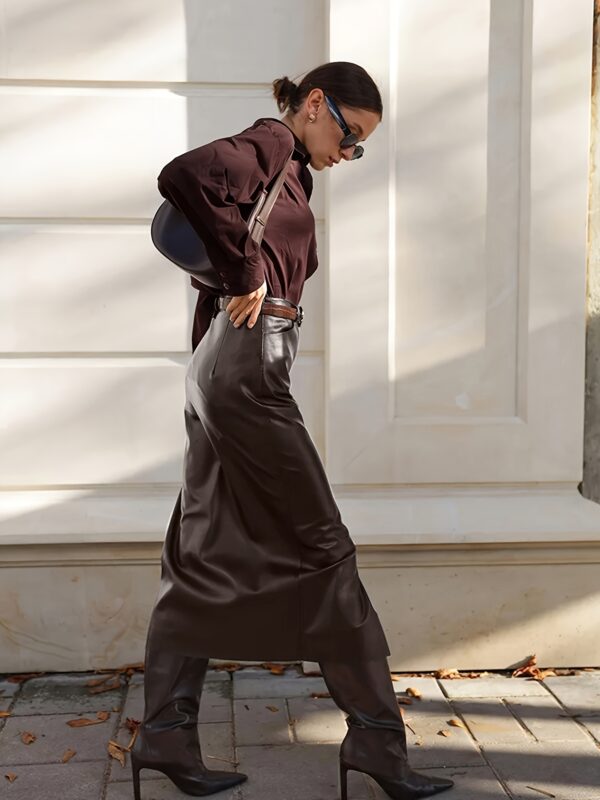 - جودة الجلد الصناعي الفاخر: صُنعت هذه التنورة من أجود أنواع الجلد الصناعي (PU Leather)، مما يوفر مظهراً فاخراً وملمساً ناعماً يحاكي الجلد الطبيعي، ويضمن متانة وجودة تدوم طويلاً.