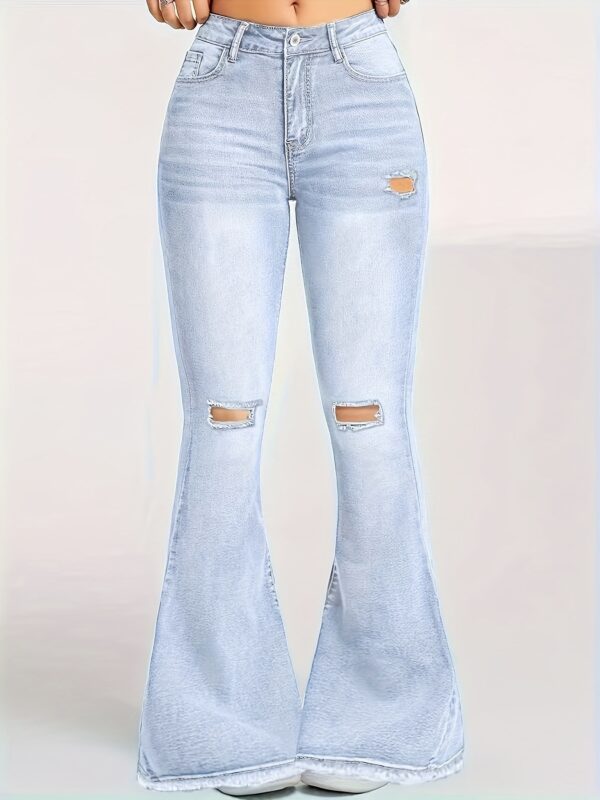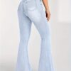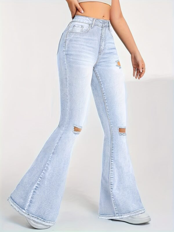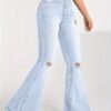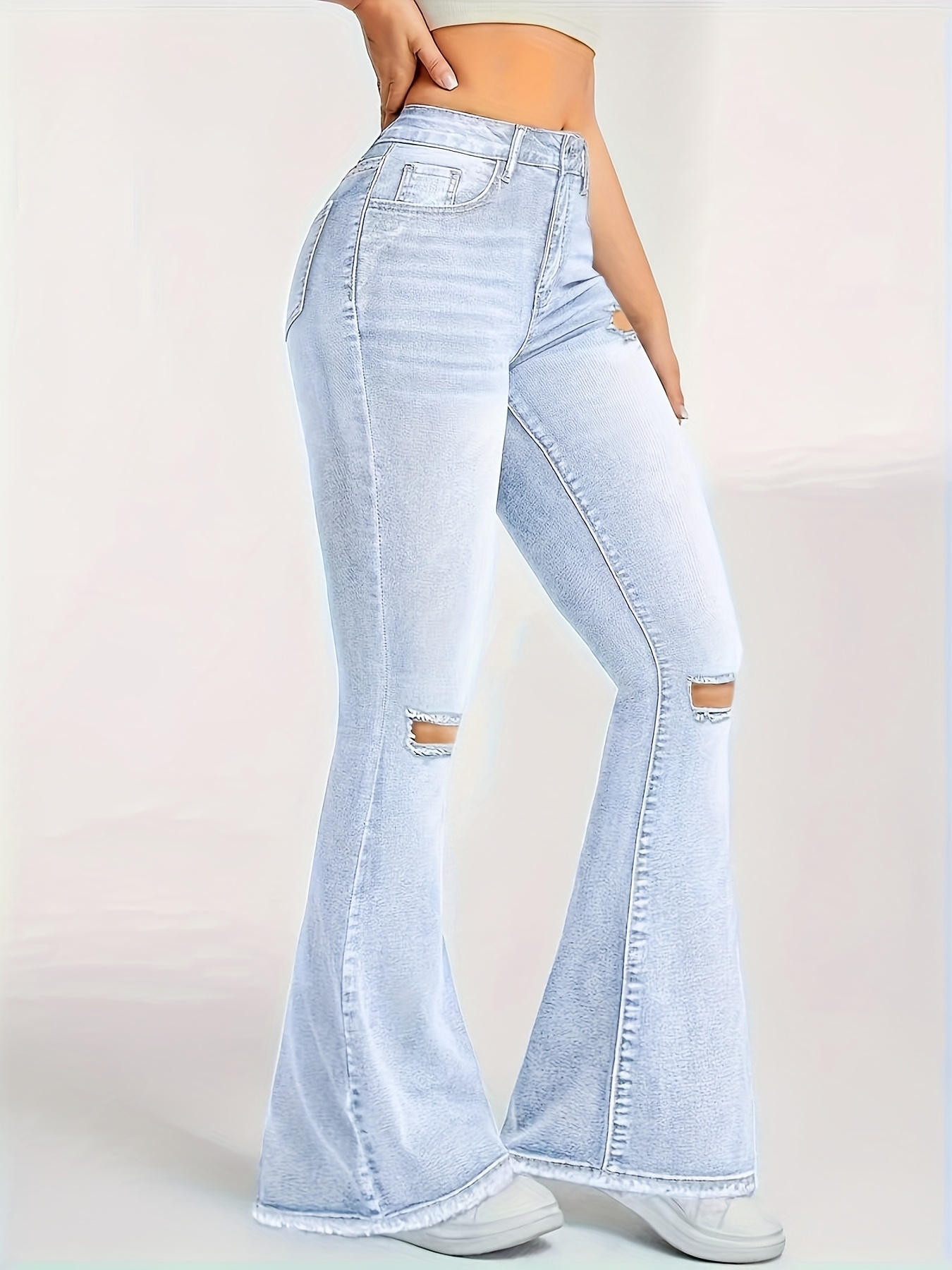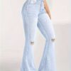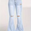 اكتشفي قمة الأناقة والراحة مع بنطلون الجينز النسائي بتصميمه الفريد، رفيقك المثالي لإطلالة تخطف الأنظار في ليالي الربيع والخريف. يجمع هذا البنطلون بين الأناقة العصرية والراحة المطلقة بفضل قصته الضيقة التي تبرز جمال قوامك، وخصره العالي الذي يمنحك شعوراً بالثقة، مع أرجل جرس واسعة تعود بنا إلى أجواء السبعينات الساحرة. يأتيك باللون الأزرق الفاتح مع تفاصيل ممزقة أنيقة تضفي لمسة جريئة ومميزة، ومصنوع من دينم عالي المرونة ليضمن لك حرية الحركة طوال الوقت.