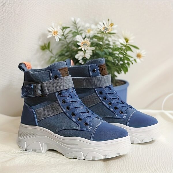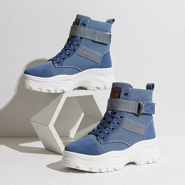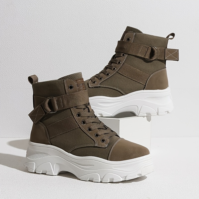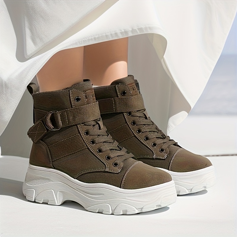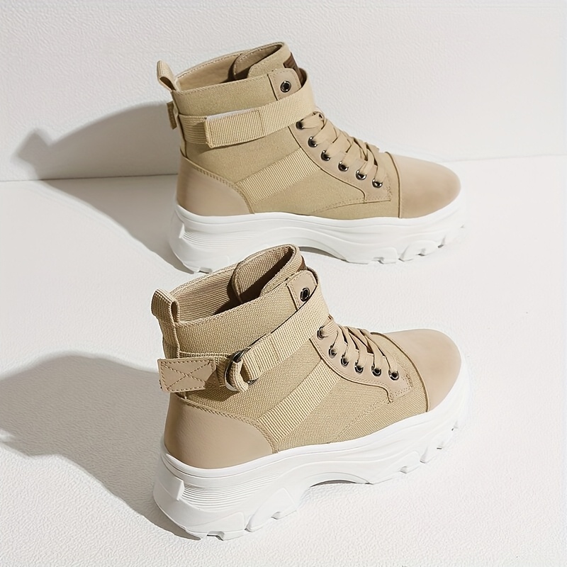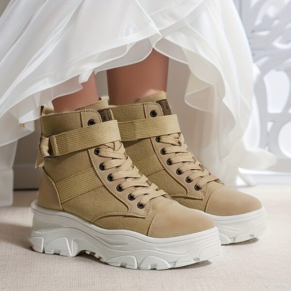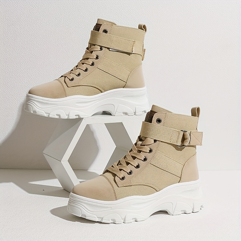 - تصميم عصري وجذاب: حذاء كاحل بلاتفورم سميك برباط يمنحك إطلالة فريدة وكاجوال أنيقة، مع مقدمة مستديرة مريحة ولون بيج سادة يناسب كل التنسيقات.