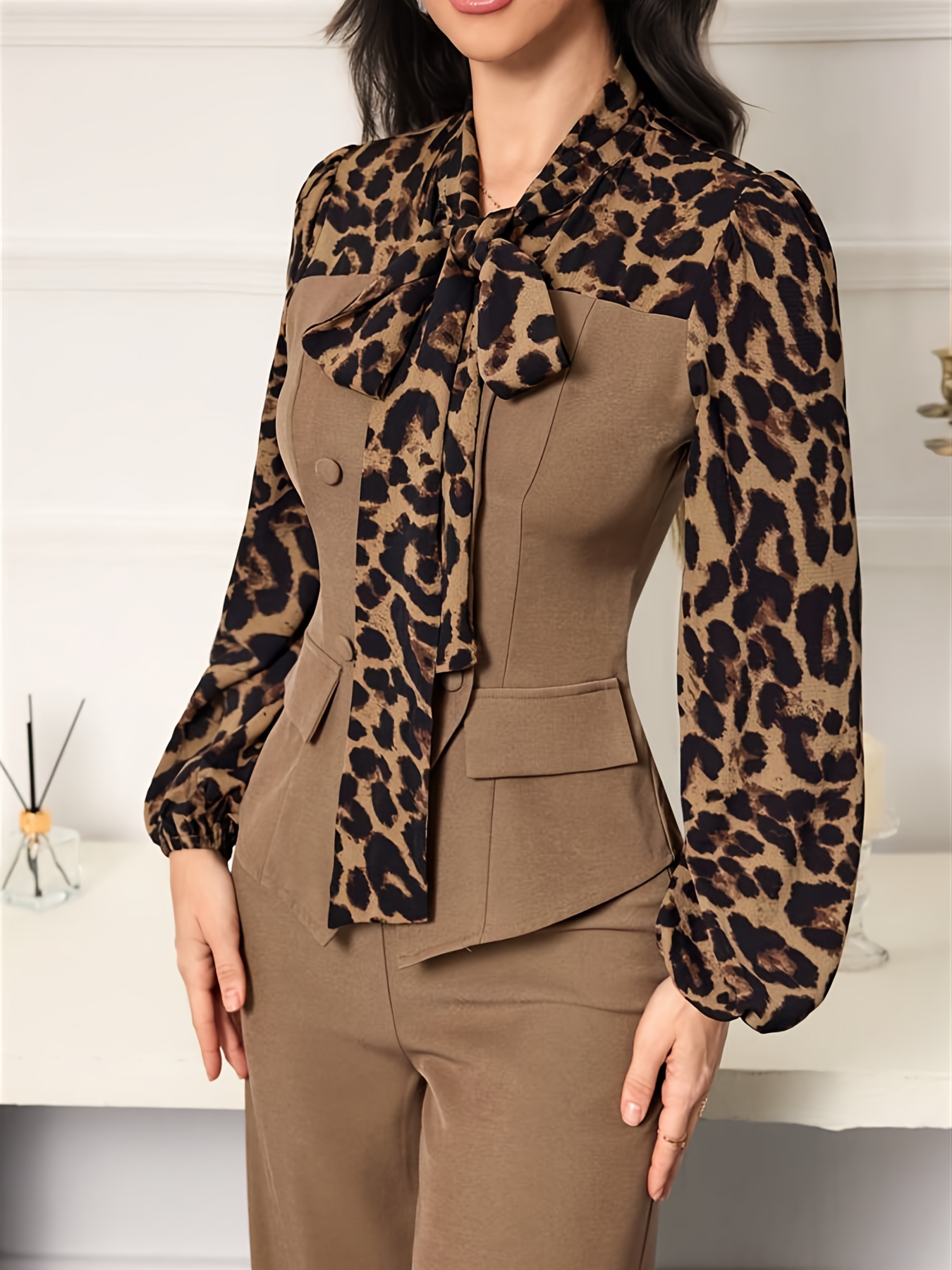 - تصميم فريد وجريء: يتميز الطقم بتداخلات جذابة من نقشة الفهد، مما يضفي لمسة عصرية وفخمة على القصة التقليدية، مع أكمام ذات ثنيات ناعمة تزيد من جاذبية التصميم.
