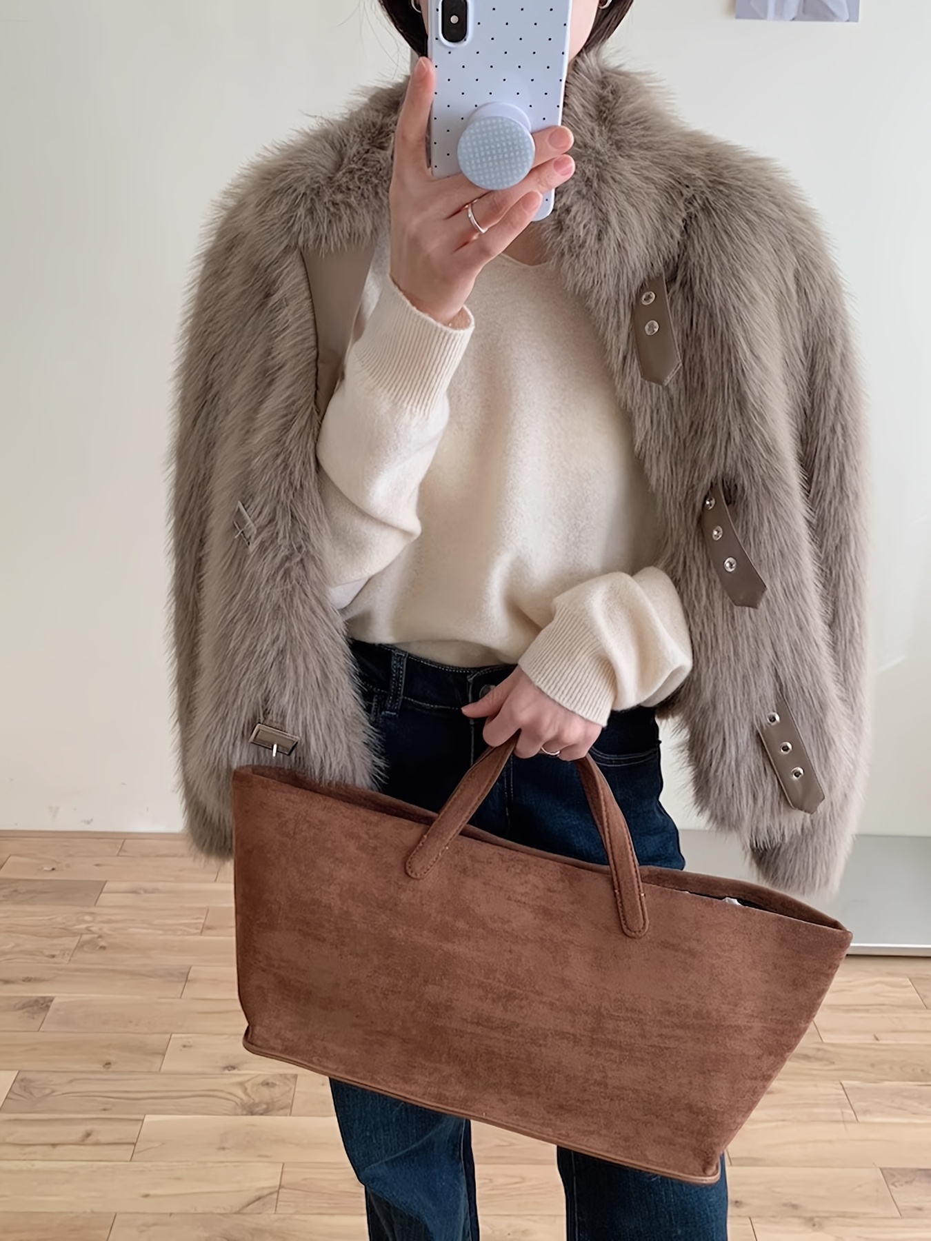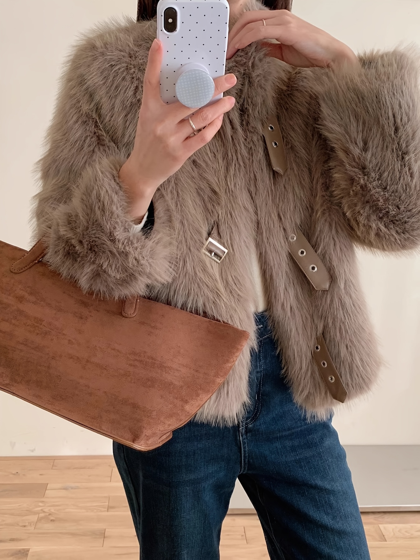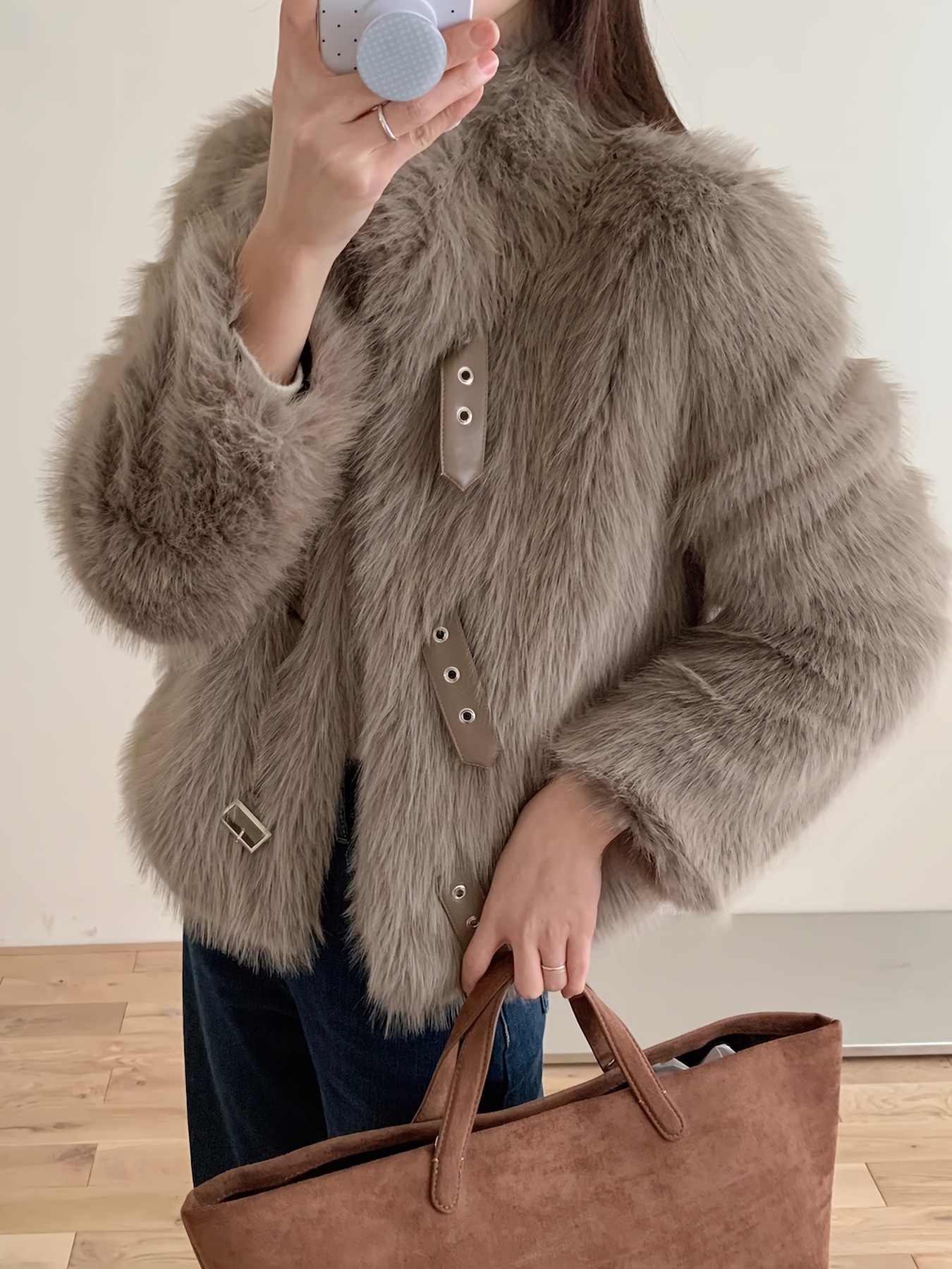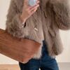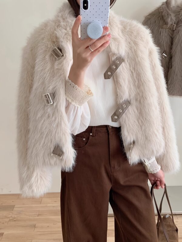 • فخامة الملمس: استمتعي بملمس الفرو الصناعي الفاخر الذي يحاكي الفرو الطبيعي ببراعة، مصنوع بالكامل من 100% بوليستر عالي الجودة ليوفر لكِ دفئًا ونعومة لا تقاوم.