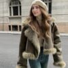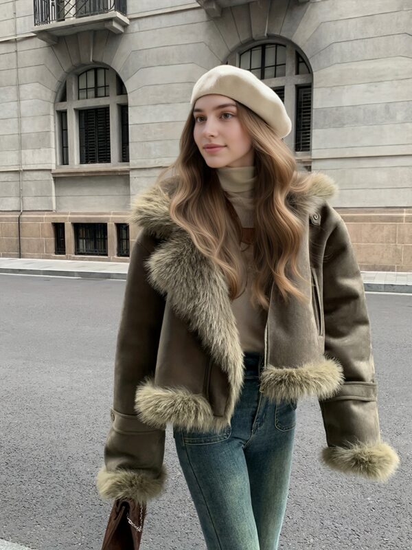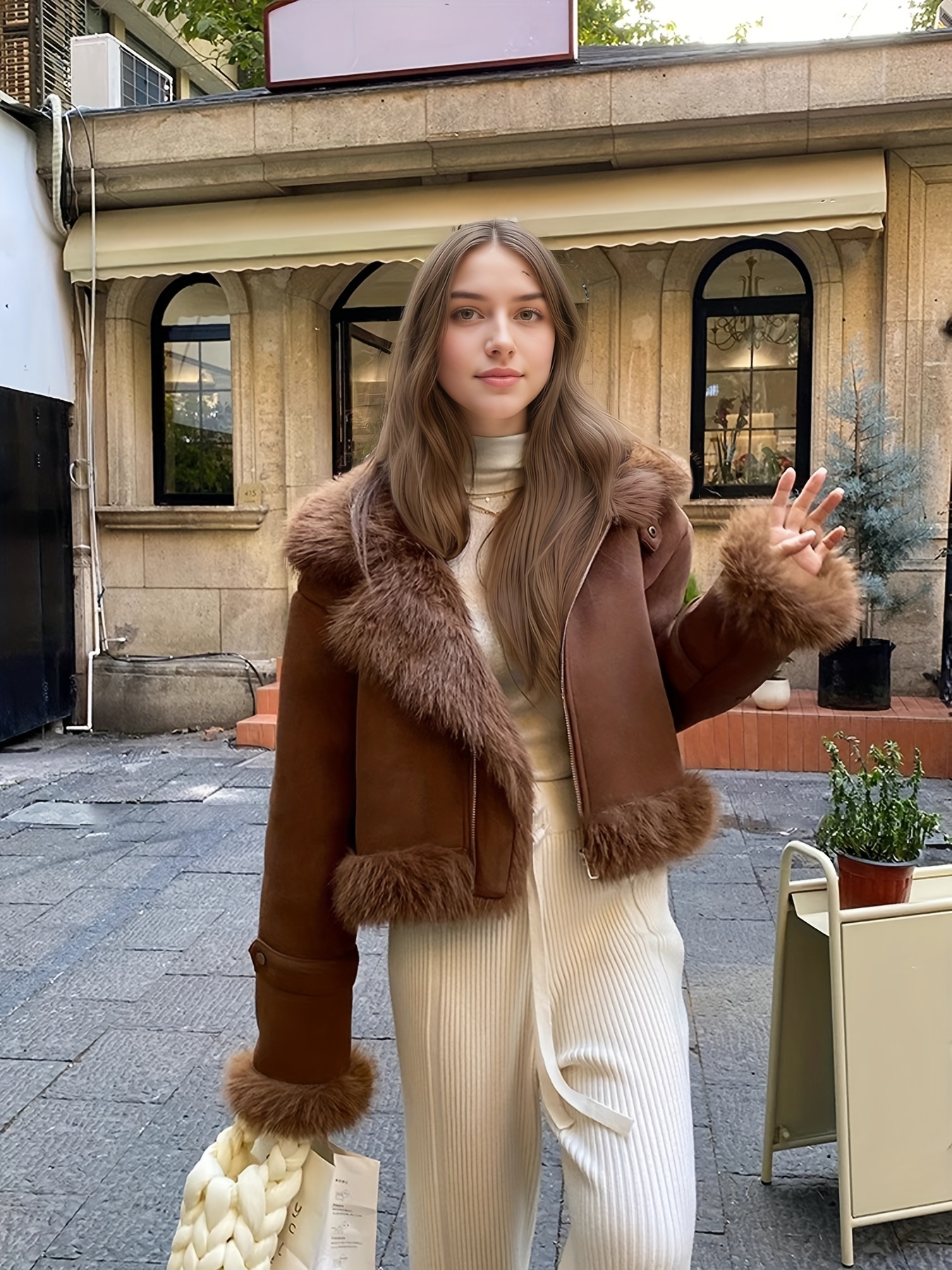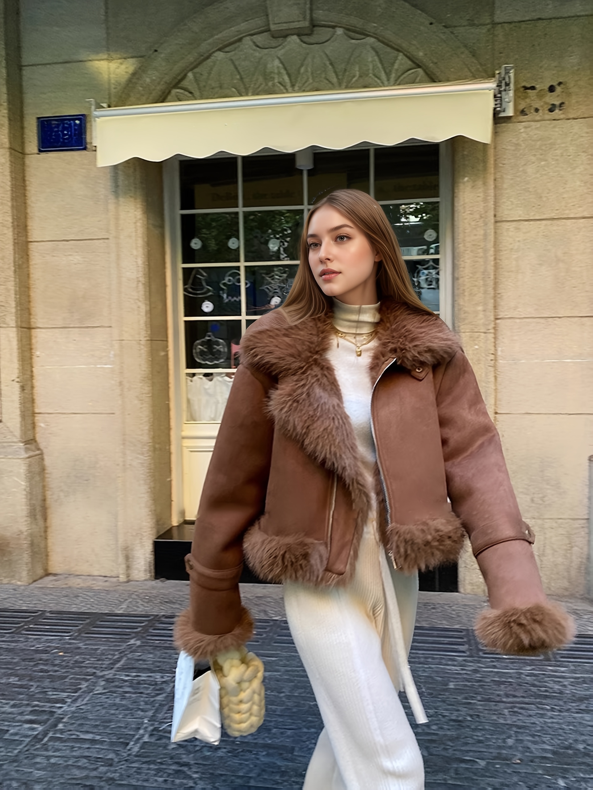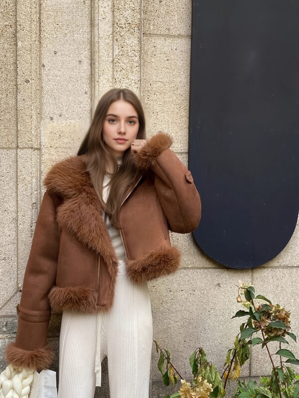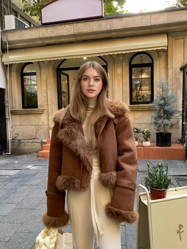 استعدي لاستقبال موسم البرد بأناقة لا مثيل لها مع جاكيت الفرو الصناعي الفاخر هذا. مصمم ليمنحك الدفء المطلق والشعور بالرفاهية، وهو الإضافة المثالية لخزانة ملابسك الشتوية.
