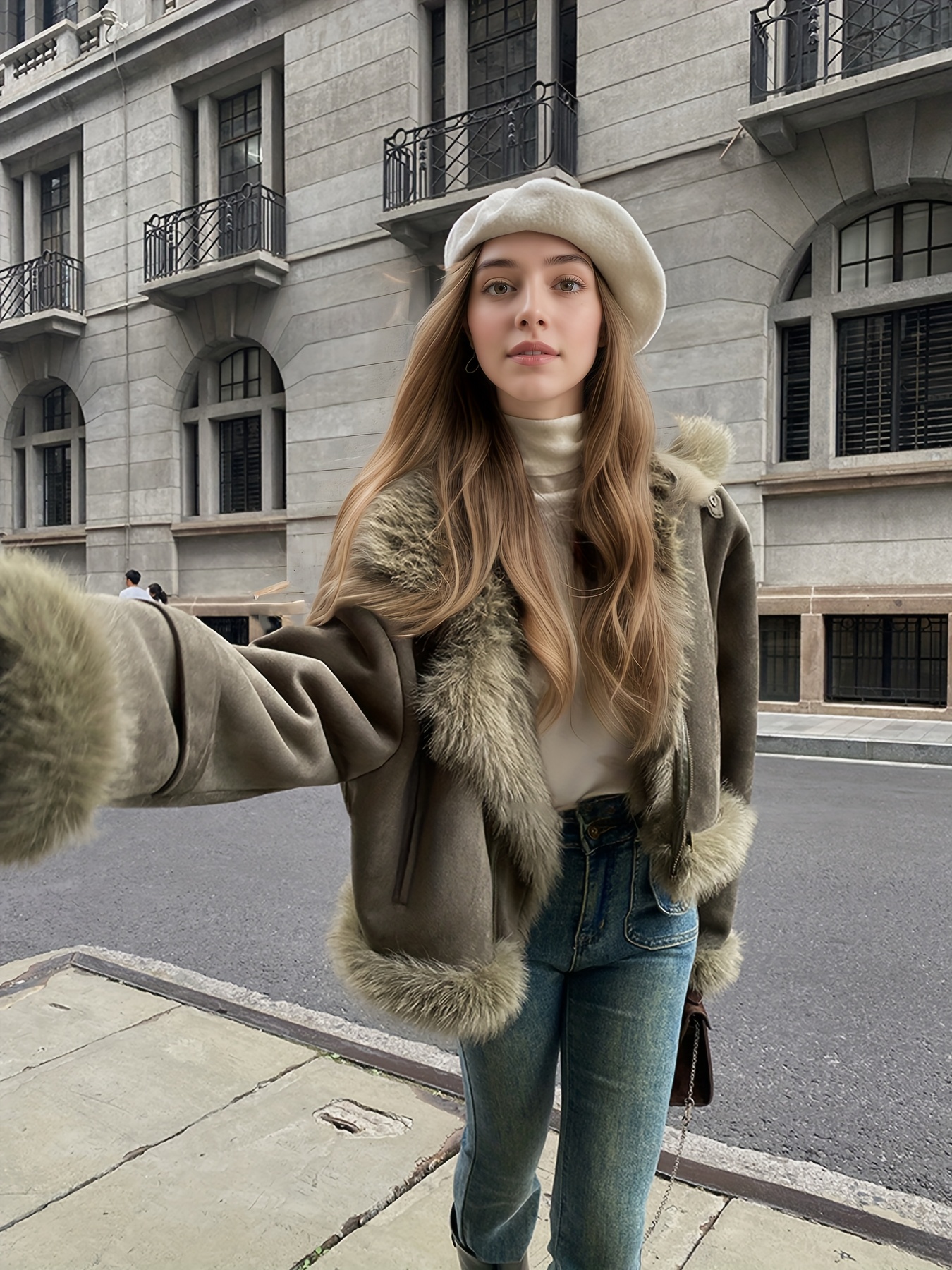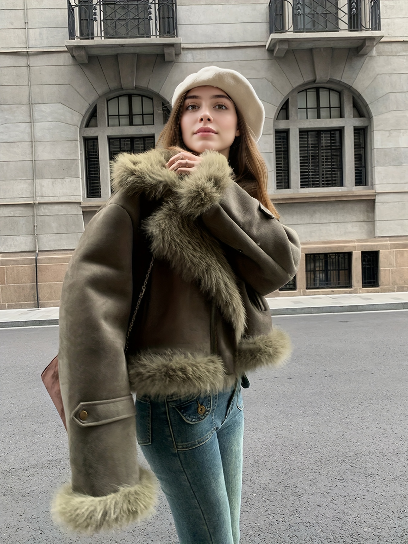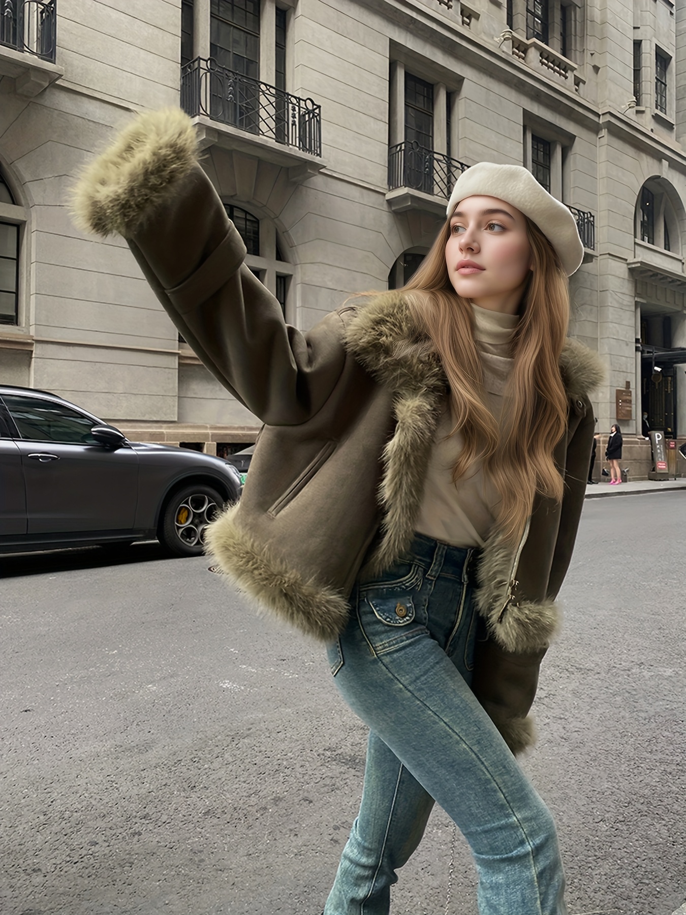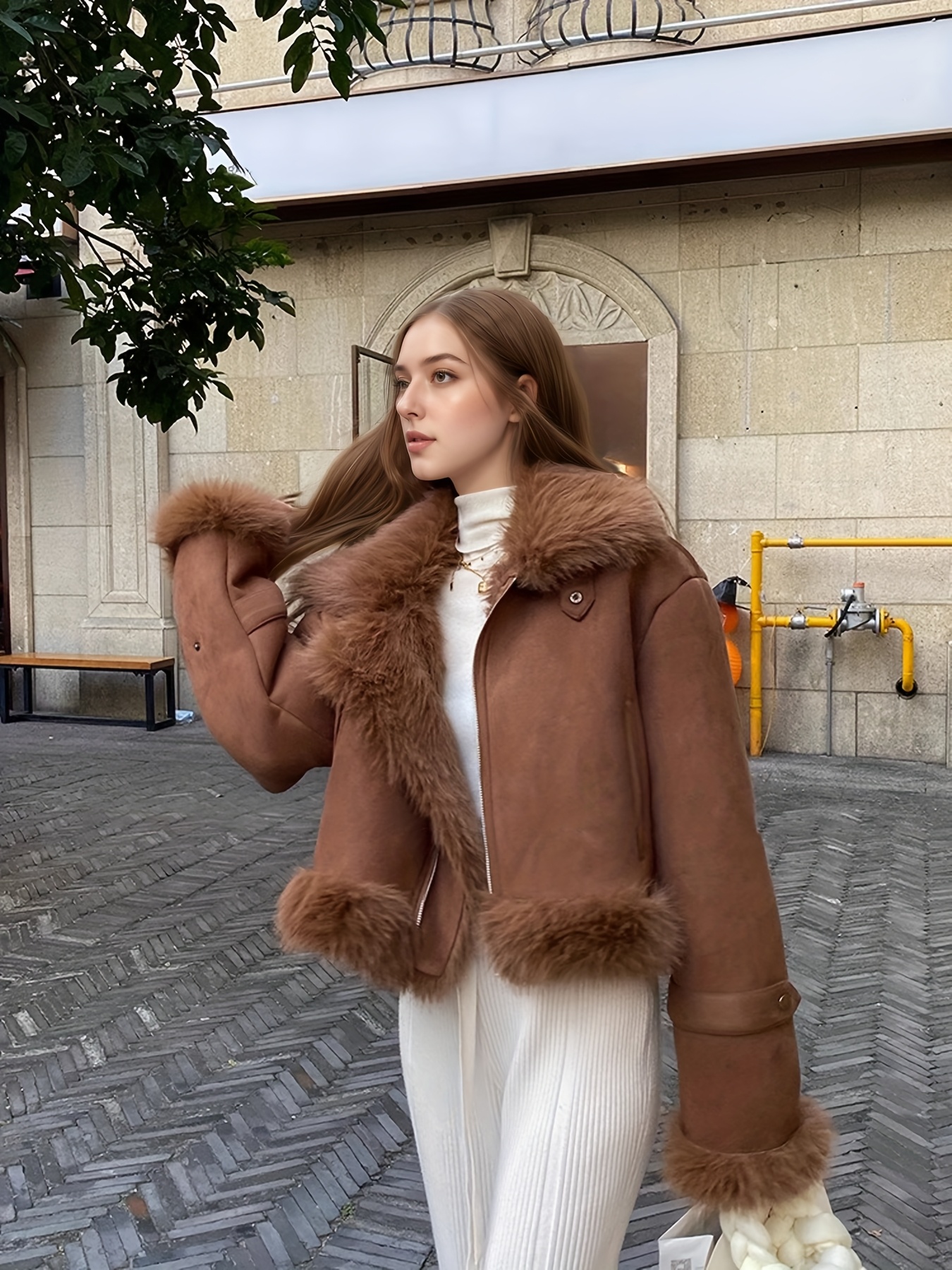 استعدي لاستقبال موسم البرد بأناقة لا مثيل لها مع جاكيت الفرو الصناعي الفاخر هذا. مصمم ليمنحك الدفء المطلق والشعور بالرفاهية، وهو الإضافة المثالية لخزانة ملابسك الشتوية.