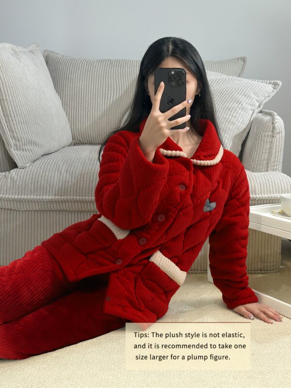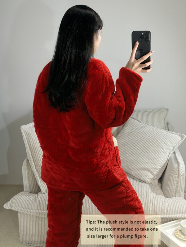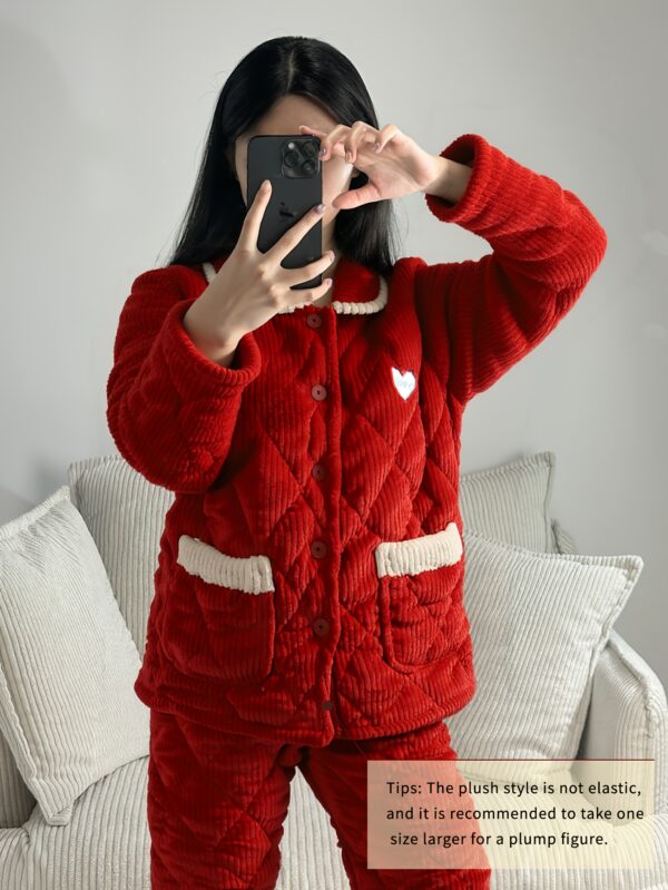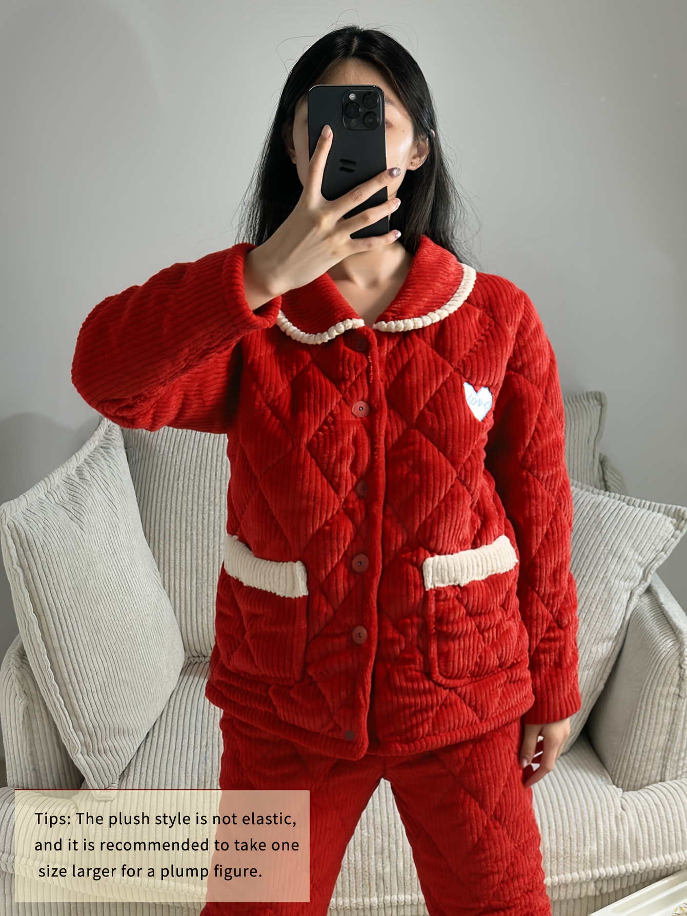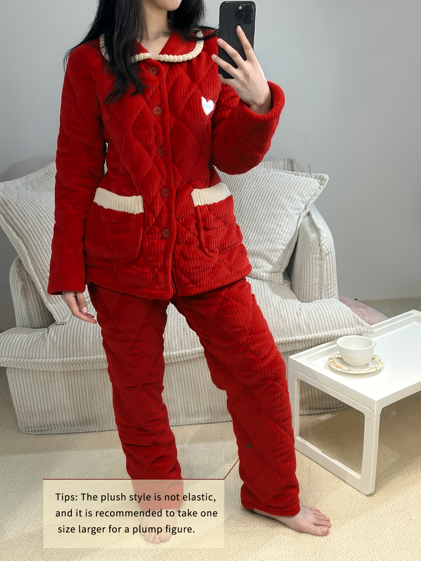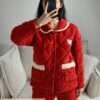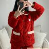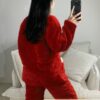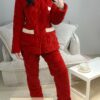 تخيلي نفسكِ محاطة بالدفء والنعومة بعد يوم طويل، في طقم بيجامة يجمع بين الفخامة والراحة المطلقة. نقدم لكِ طقم البيجامة الأحمر المبطّن، المصمم خصيصاً ليمنحكِ إحساساً بالراحة والأناقة حتى في منزلكِ. مع تطريز القلوب الساحرة وتصميمه الدافئ، ستصبحين متلهفة للعودة إلى منزلكِ للاسترخاء بأناقة لا متناهية.