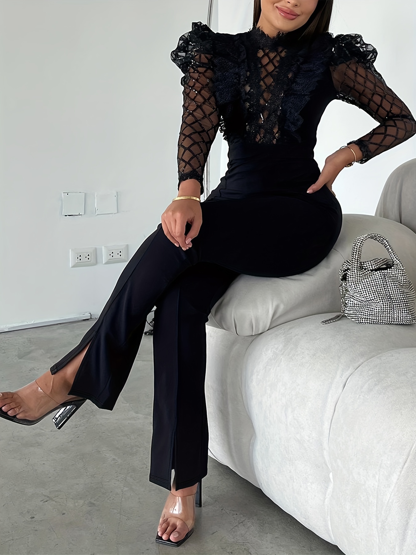 • تصميم ملكي فريد: يتميز بلون أزرق ملكي جذاب وتفاصيل دانتيل متباينة بعناية مع خرز متألق يضيف لمسة من الفخامة. تضفي الياقة الواقفة الأنيقة لمسة راقية، بينما تمنح قصة الأرجل الواسعة مع الشق الجانبي إطلالة عصرية وجريئة.