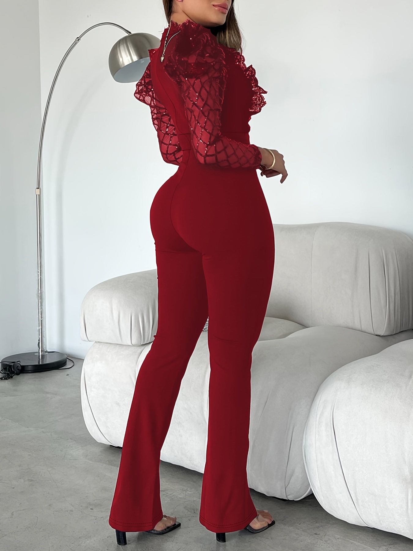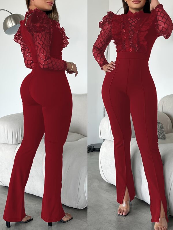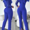 جمبسوت السهرة الفاخر باللون الأزرق الملكي: أناقة الدانتيل المتباين، بريق الخرز، وقصة الأرجل الواسعة