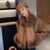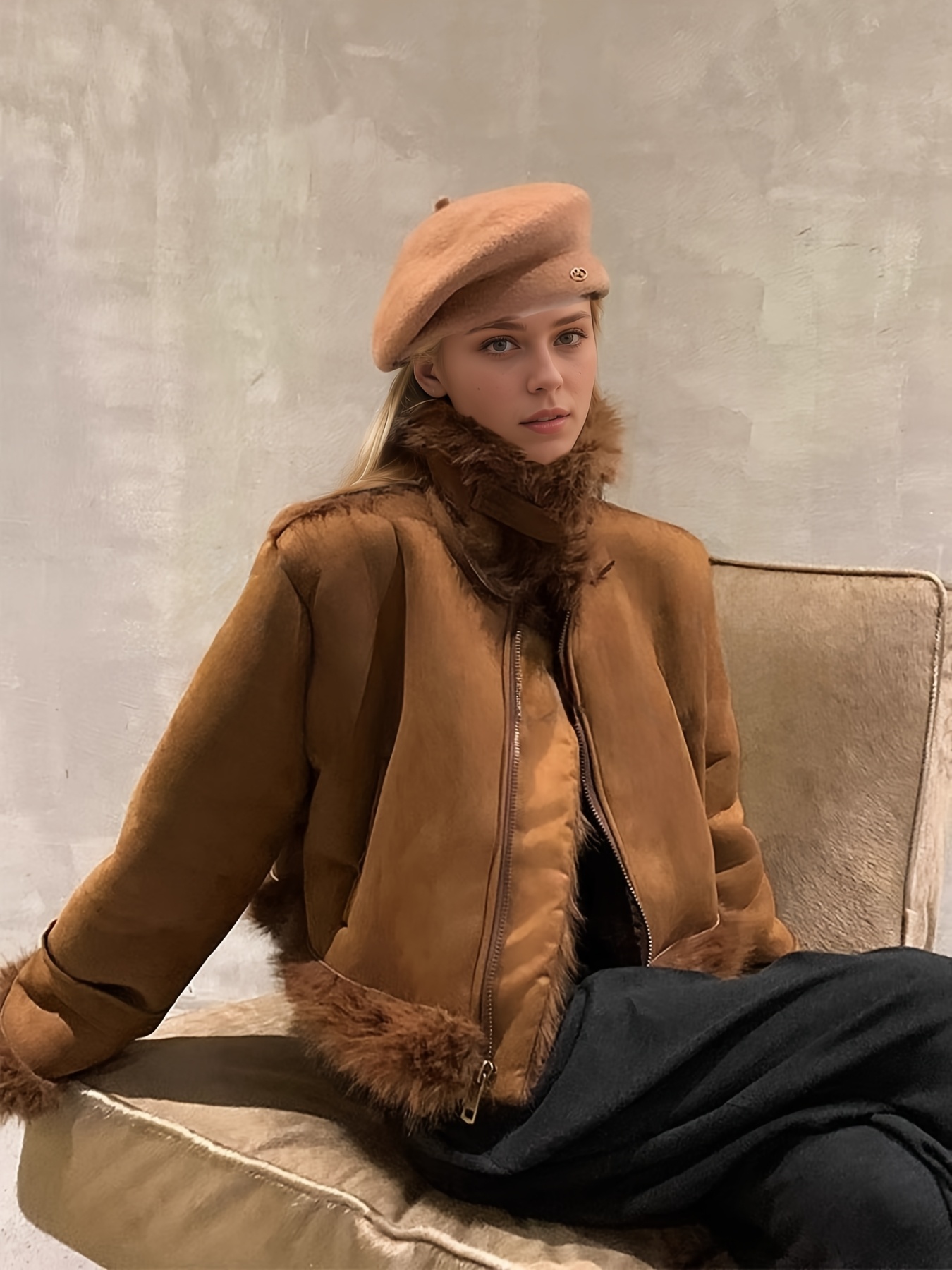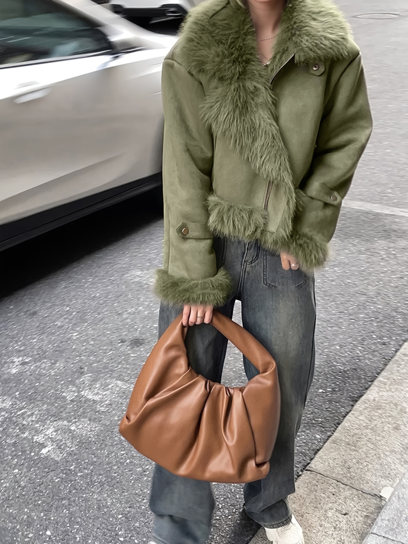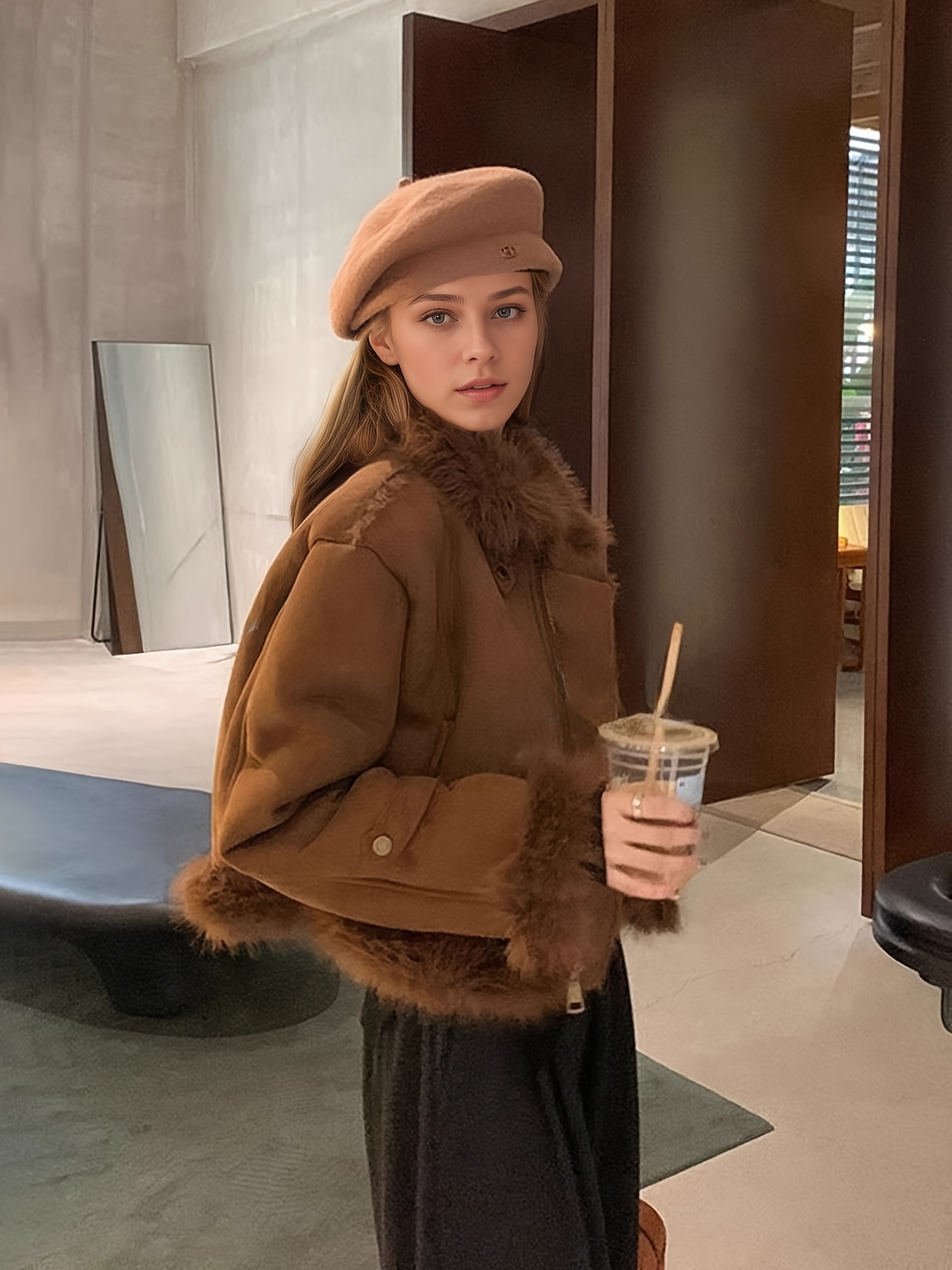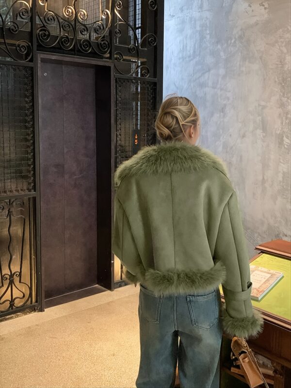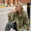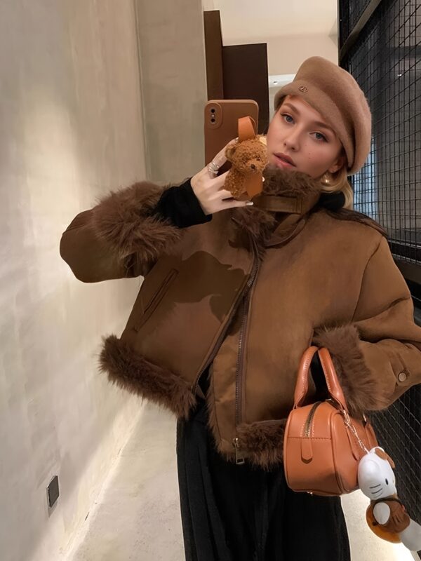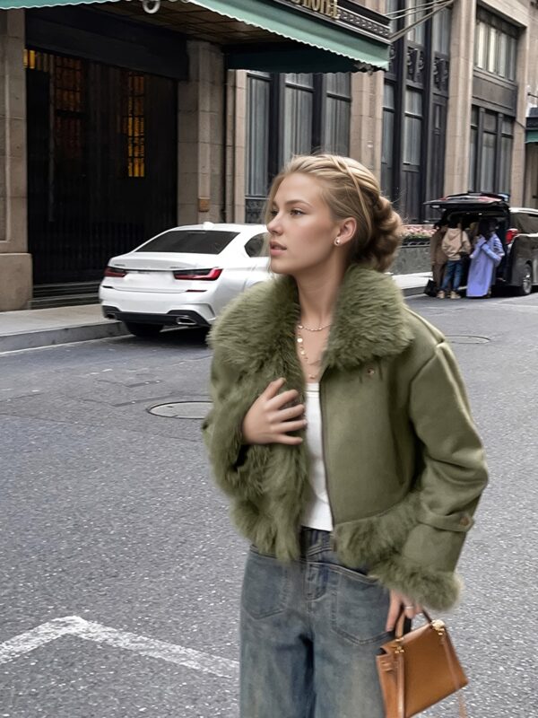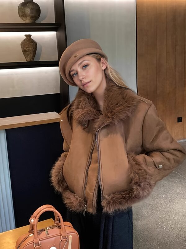 - تفاصيل مدروسة: أكمام طويلة بقصة “drop shoulder” تضفي لمسة عصرية، وتفاصيل الفراء المتباينة تزيد من جاذبية التصميم.