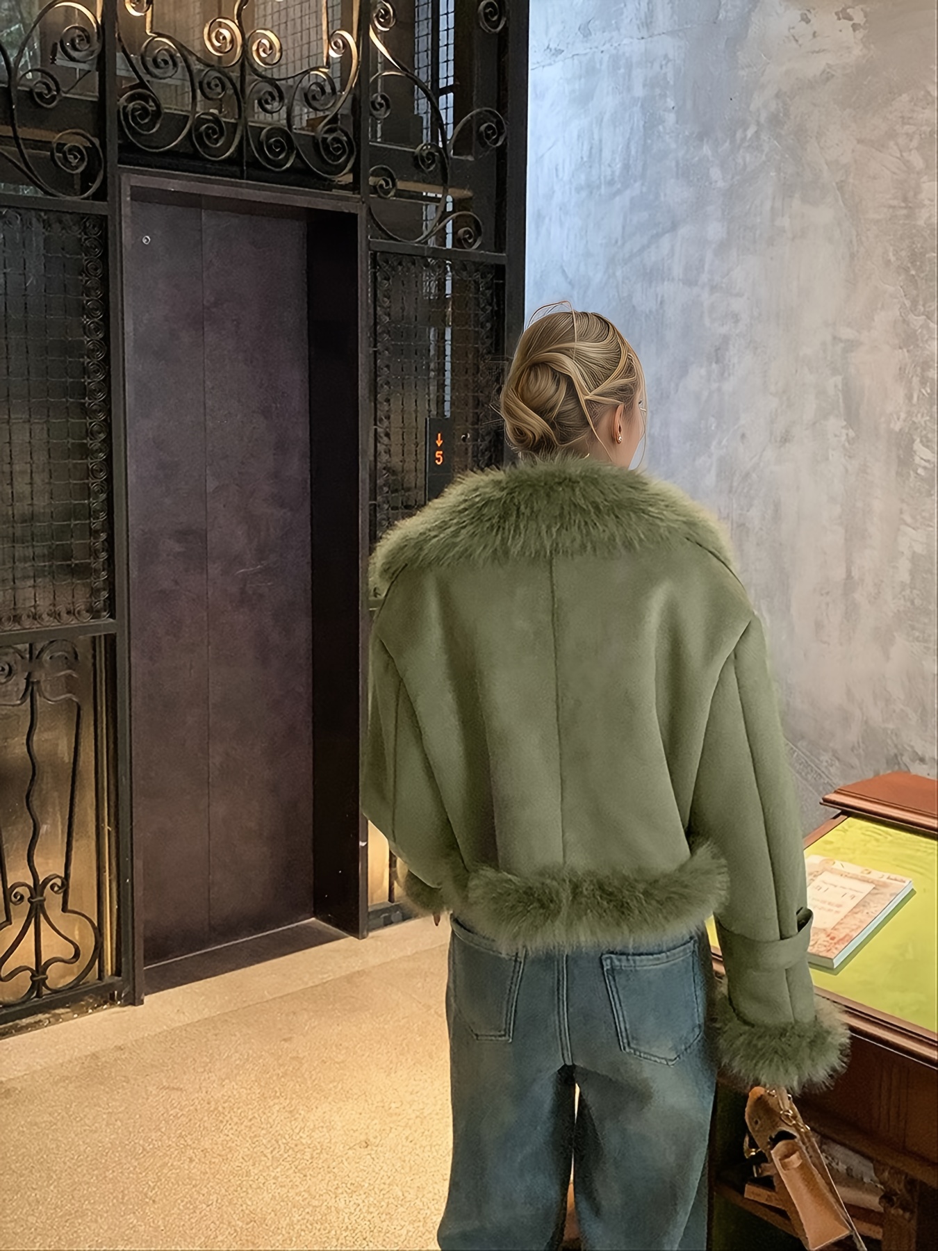 - ياقة من الفراء الصناعي الفاخر: استمتعي بدفء وراحة فائقة بفضل الياقة والتطعيمات الغنية من الفراء الصناعي عالي الجودة التي تضيف لمسة من الرقي والأناقة.