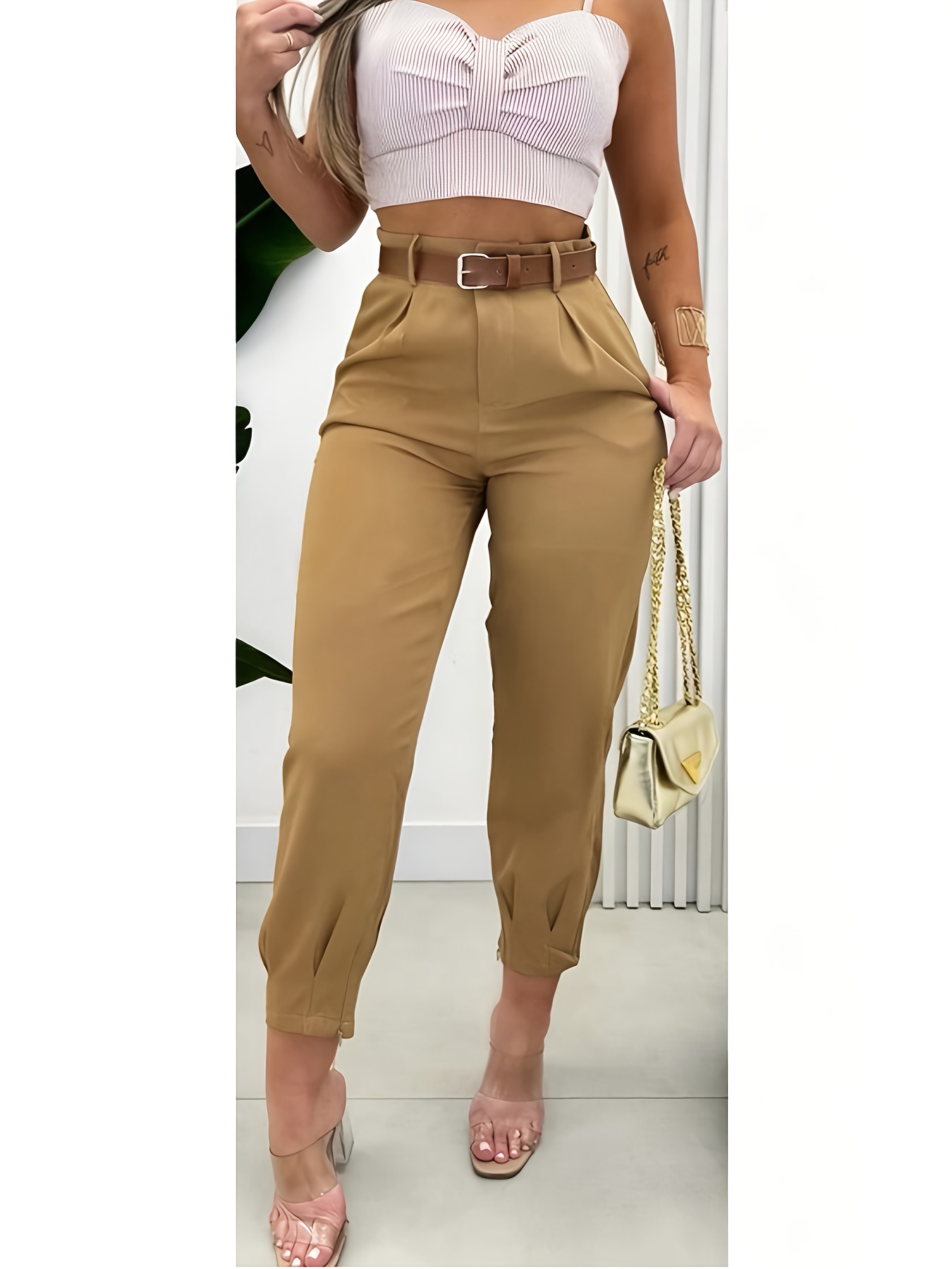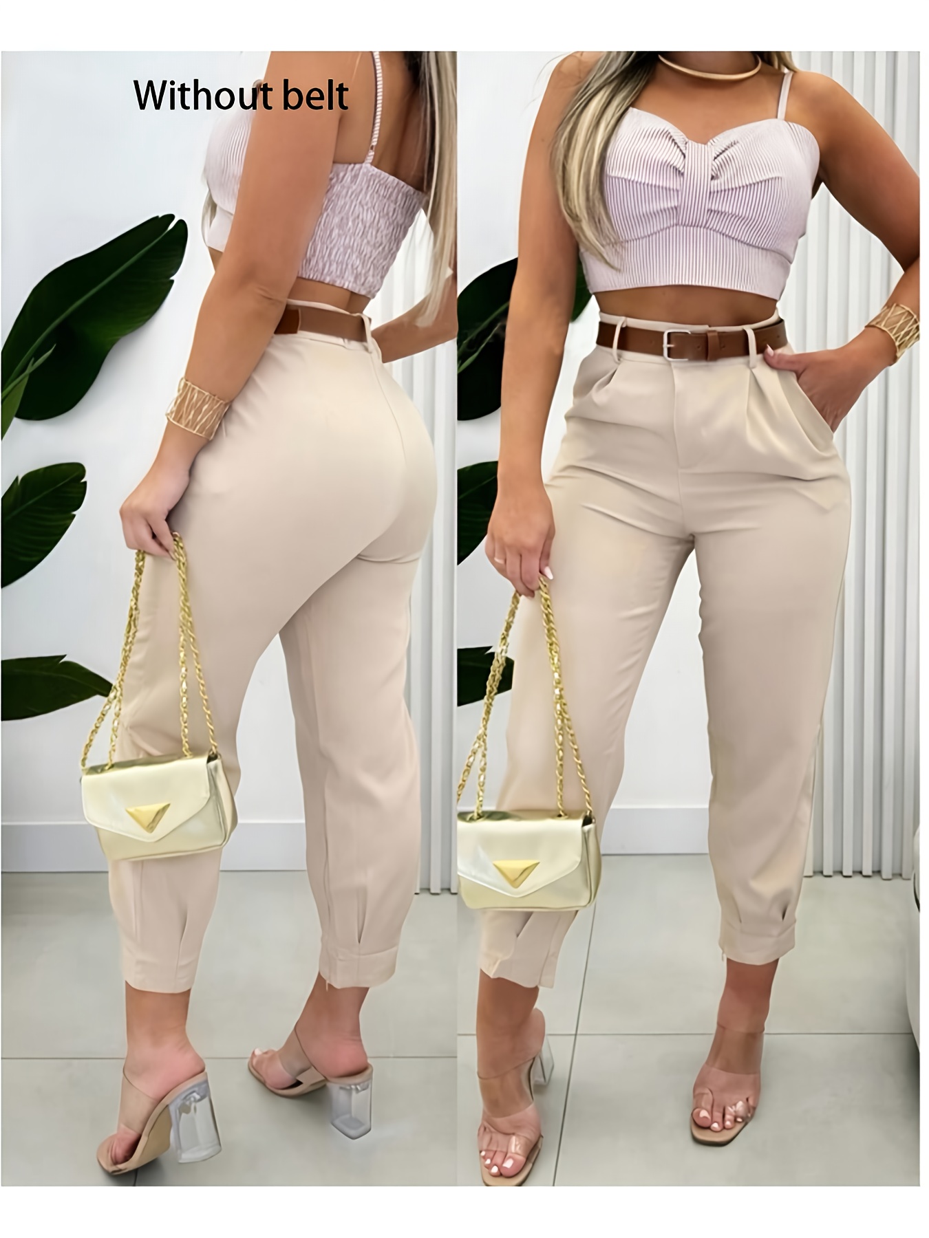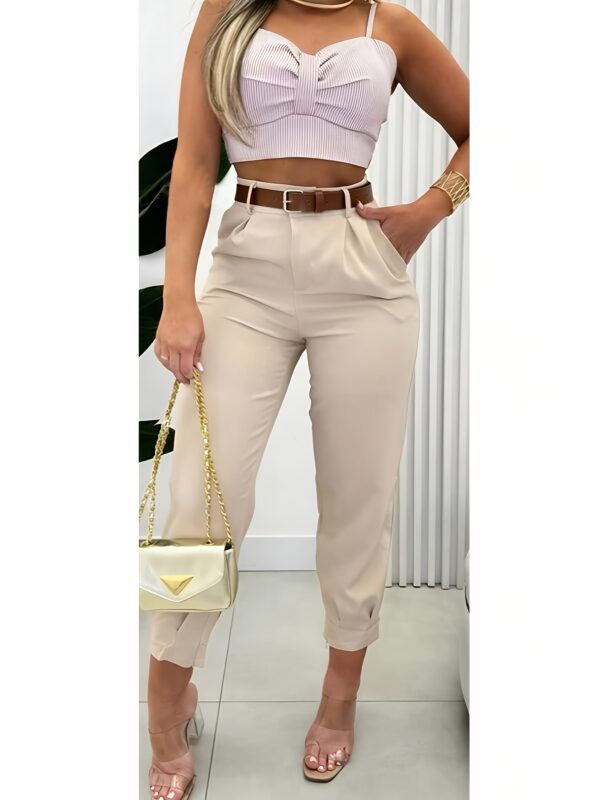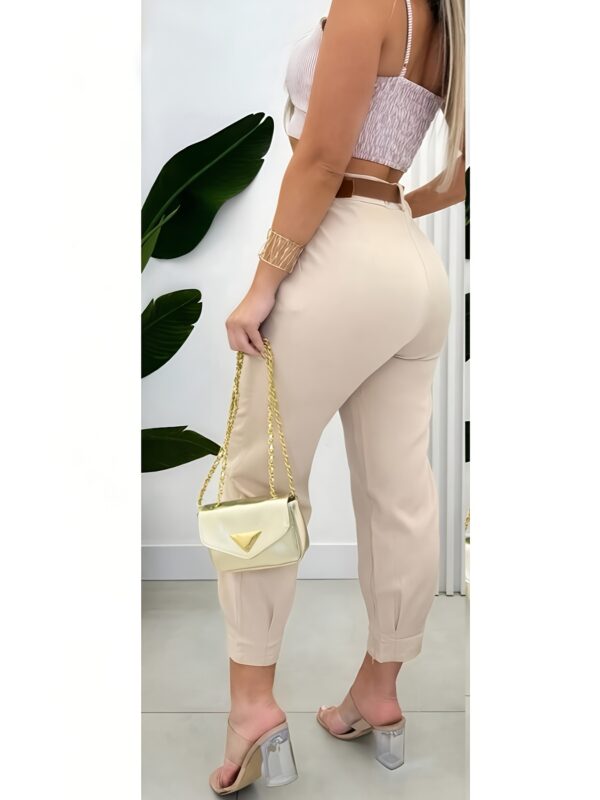 - تصميم عصري وقصة مثالية: يتميز هذا البنطال بقصة مستقيمة ونحيفة تبرز جمال قوامك، مما يجعله خيارًا مثاليًا لإطلالة أنيقة وعملية في نفس الوقت. لونه البيج الموحد يسهل تنسيقه مع أزيائك المختلفة.