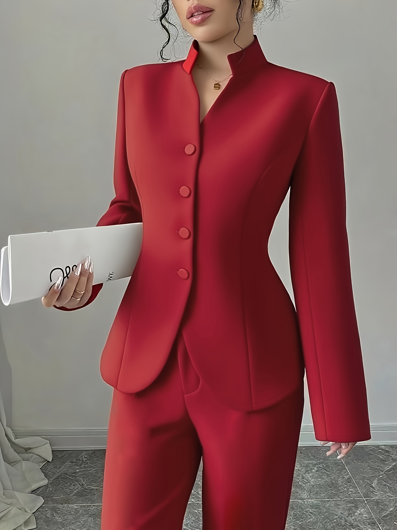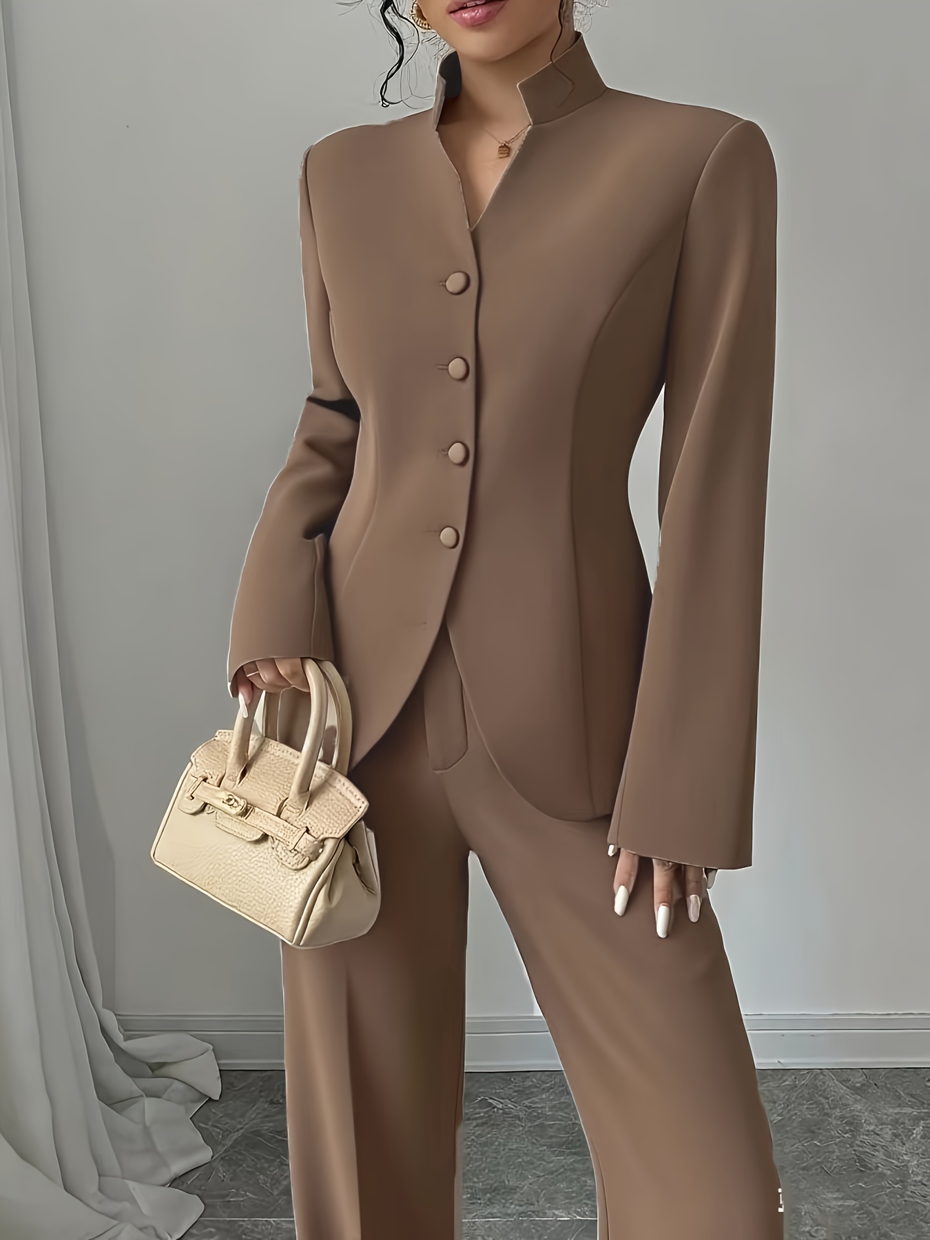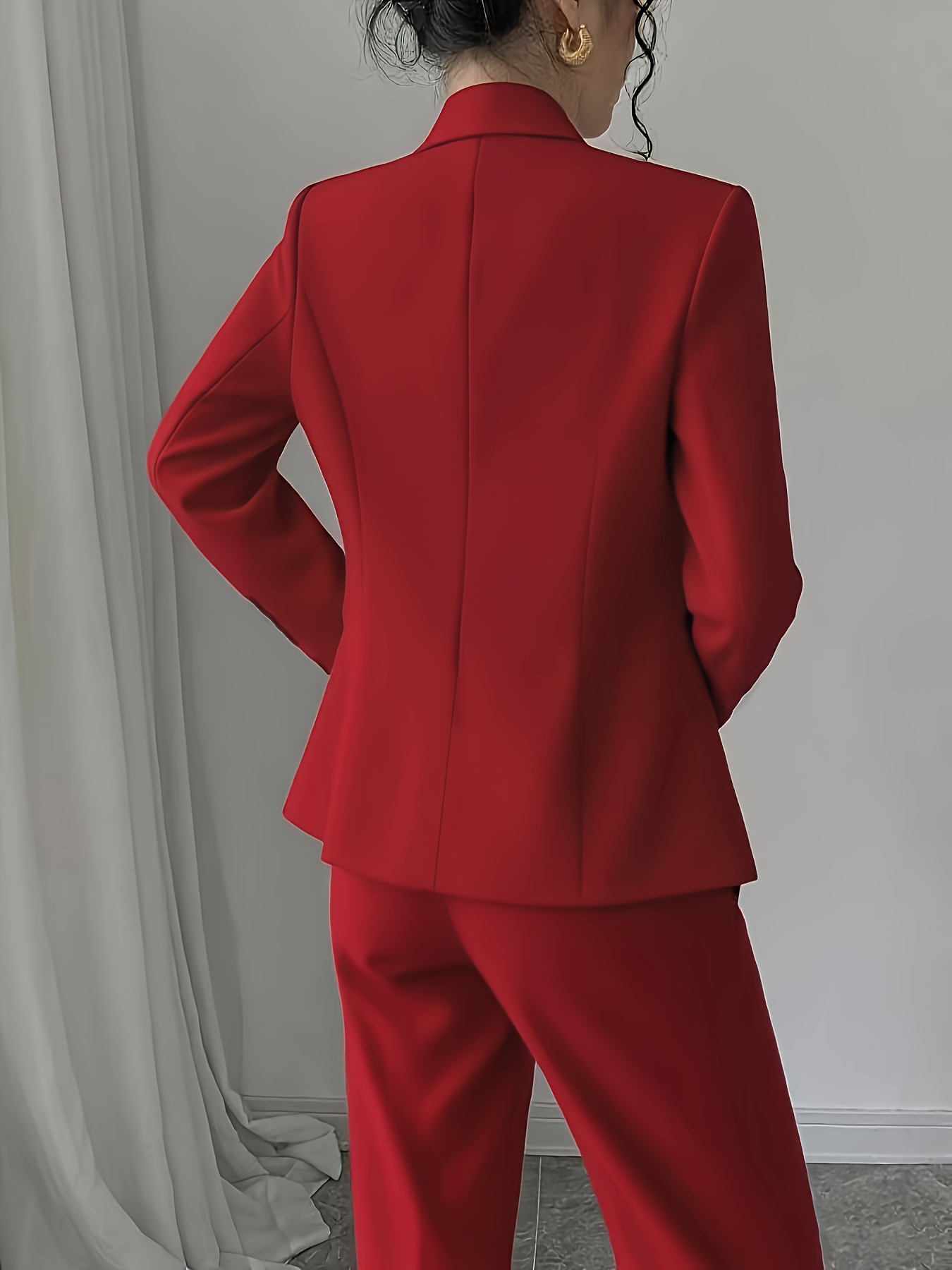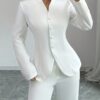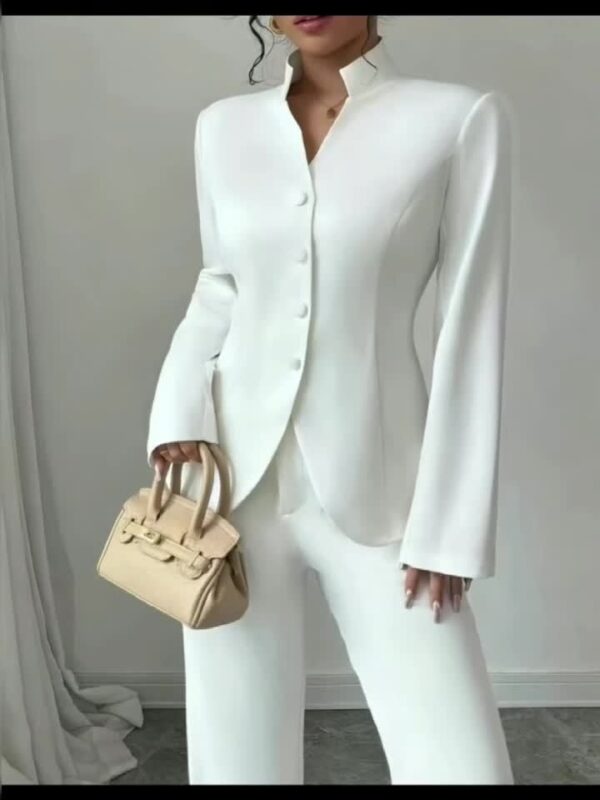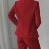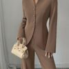- تصميم متكامل: يتكون الطقم من جاكيت أنيق بأزرار أمامية وبنطال بقصة مريحة ومناسبة، مما يوفر لك إطلالة متناسقة وجذابة.