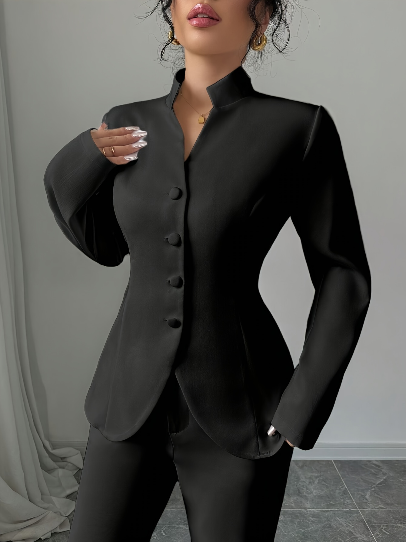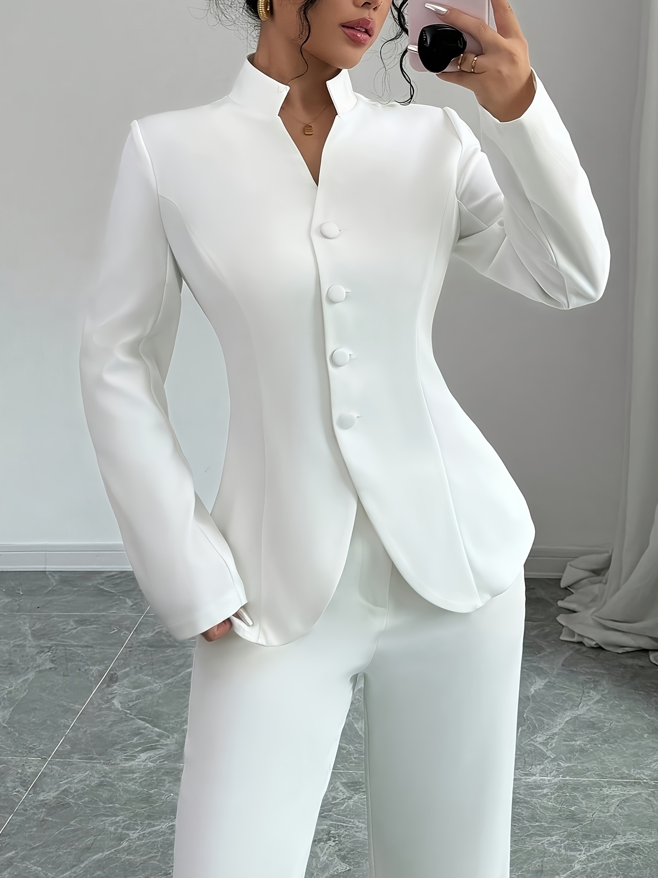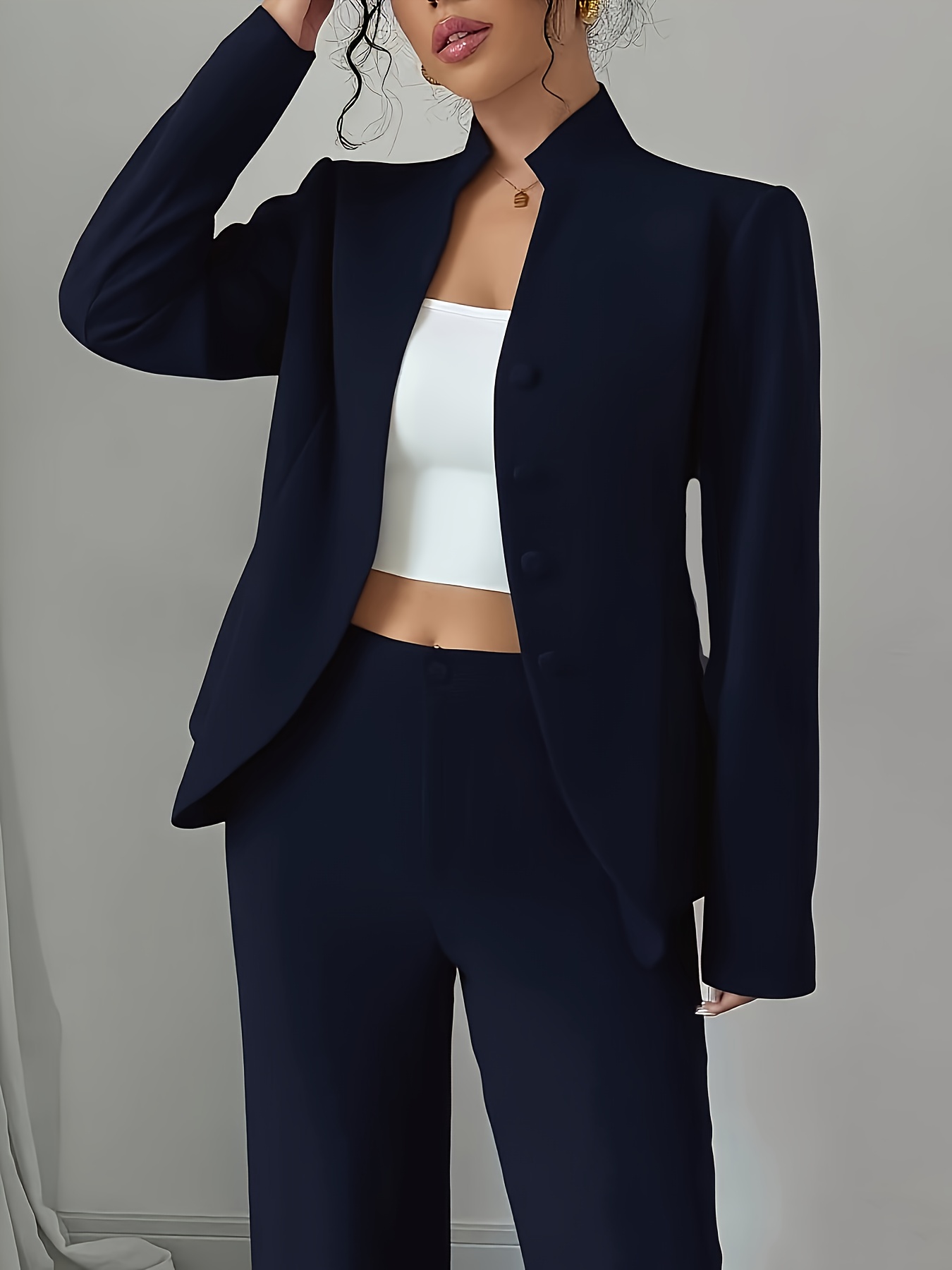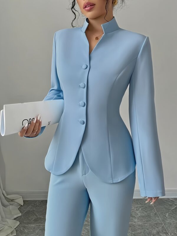 - تصميم متكامل: يتكون الطقم من جاكيت أنيق بأزرار أمامية وبنطال بقصة مريحة ومناسبة، مما يوفر لك إطلالة متناسقة وجذابة.