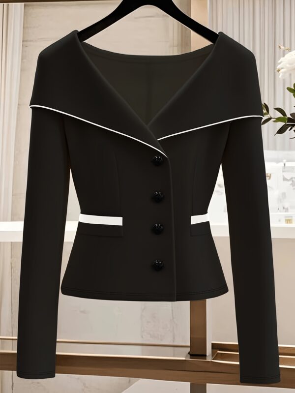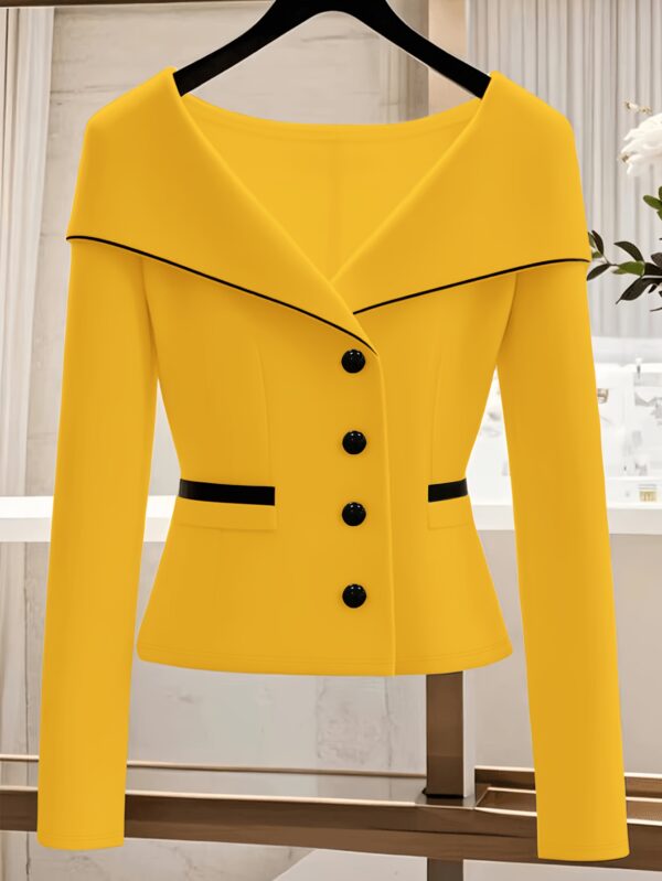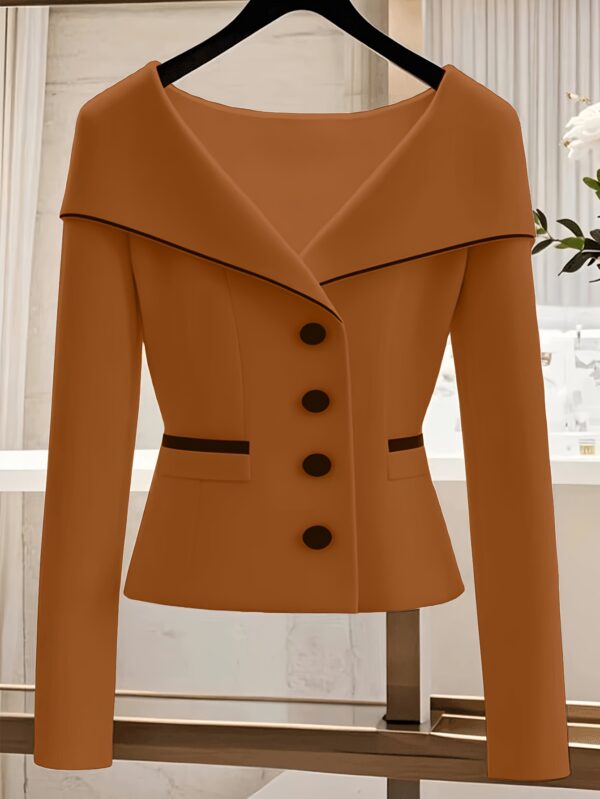 - إغلاق أمامي كلاسيكي: يأتي مع إغلاق بزرار واحد أنيق وعملي، يضفي لمسة من الرقي ويكمل التصميم البسيط للجاكيت.
