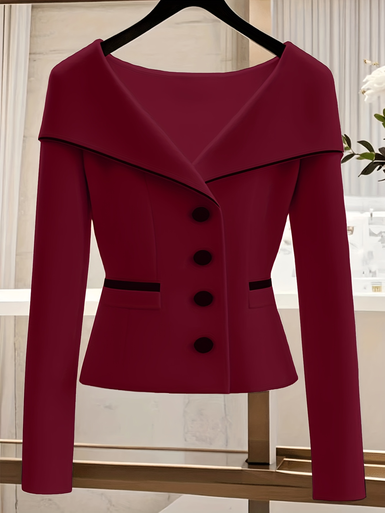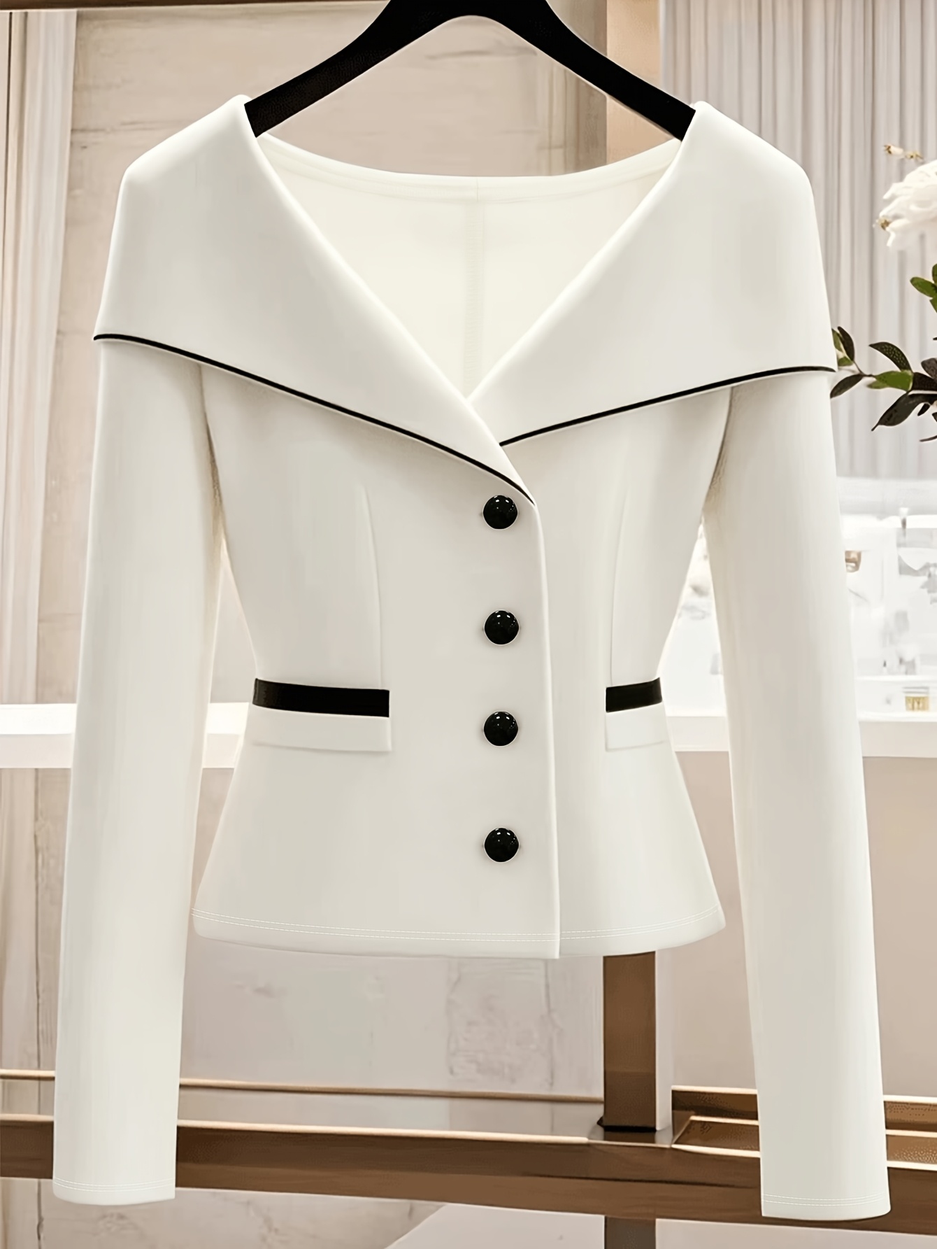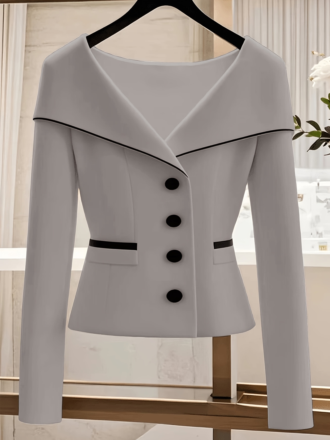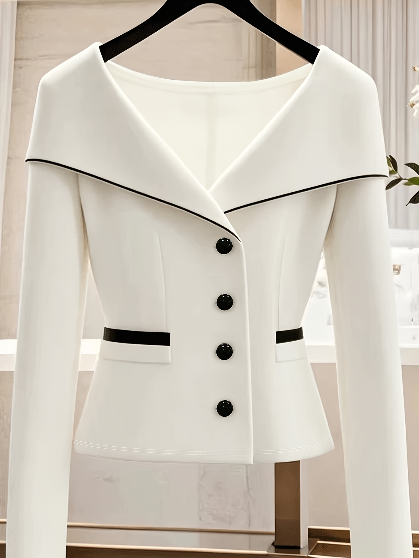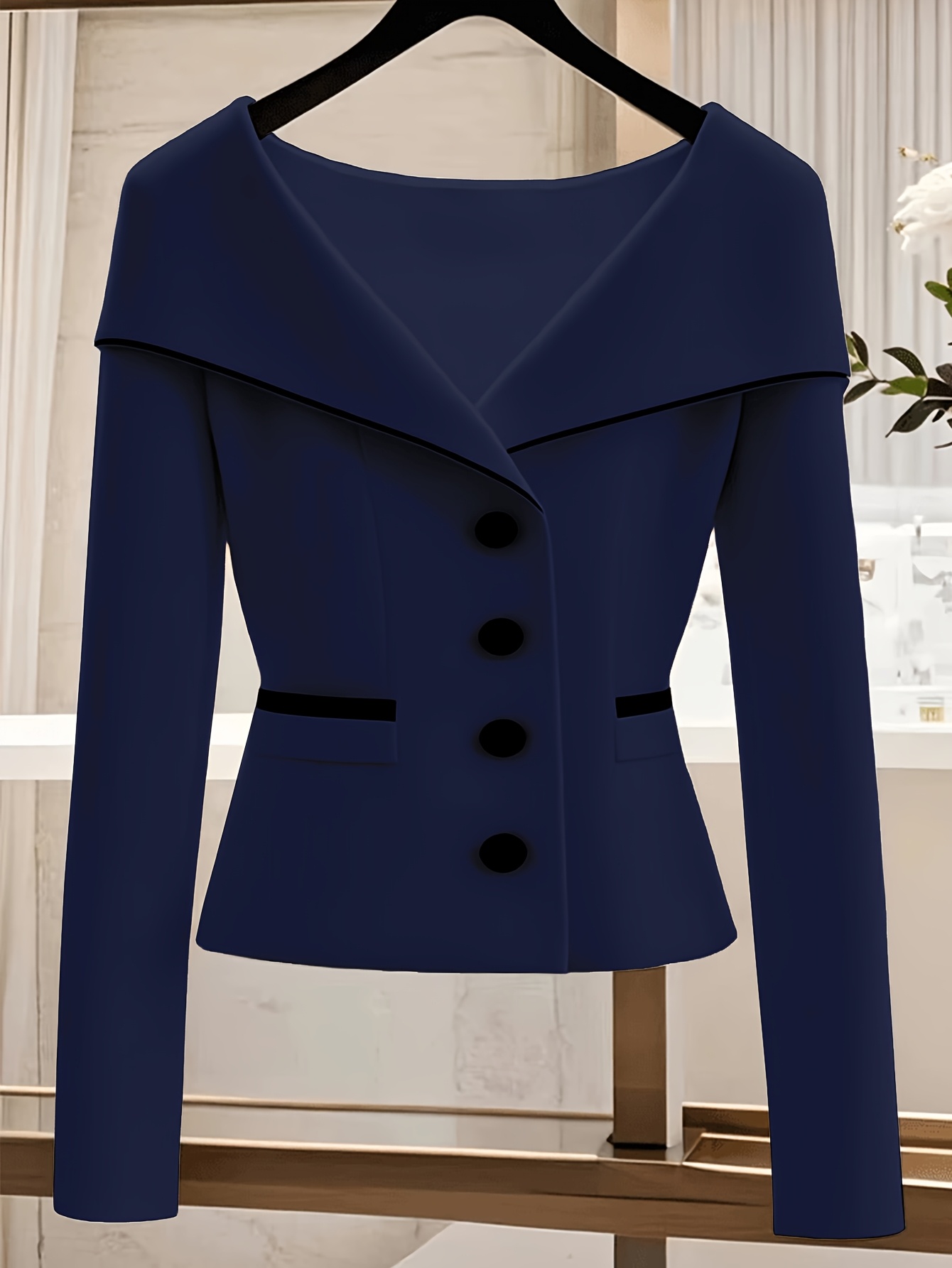 - إغلاق أمامي كلاسيكي: يأتي مع إغلاق بزرار واحد أنيق وعملي، يضفي لمسة من الرقي ويكمل التصميم البسيط للجاكيت.