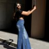 • تصميم عتيق ومواكِب: استمتعي بمظهر “الدنيم المغسول” الذي يمنحك لمسة ريترو فريدة وعصرية في آن واحد. قصتها الضيقة (Bodycon) بطول الماكسي تبرز جمال قوامك بأناقة لا تضاهى.