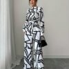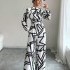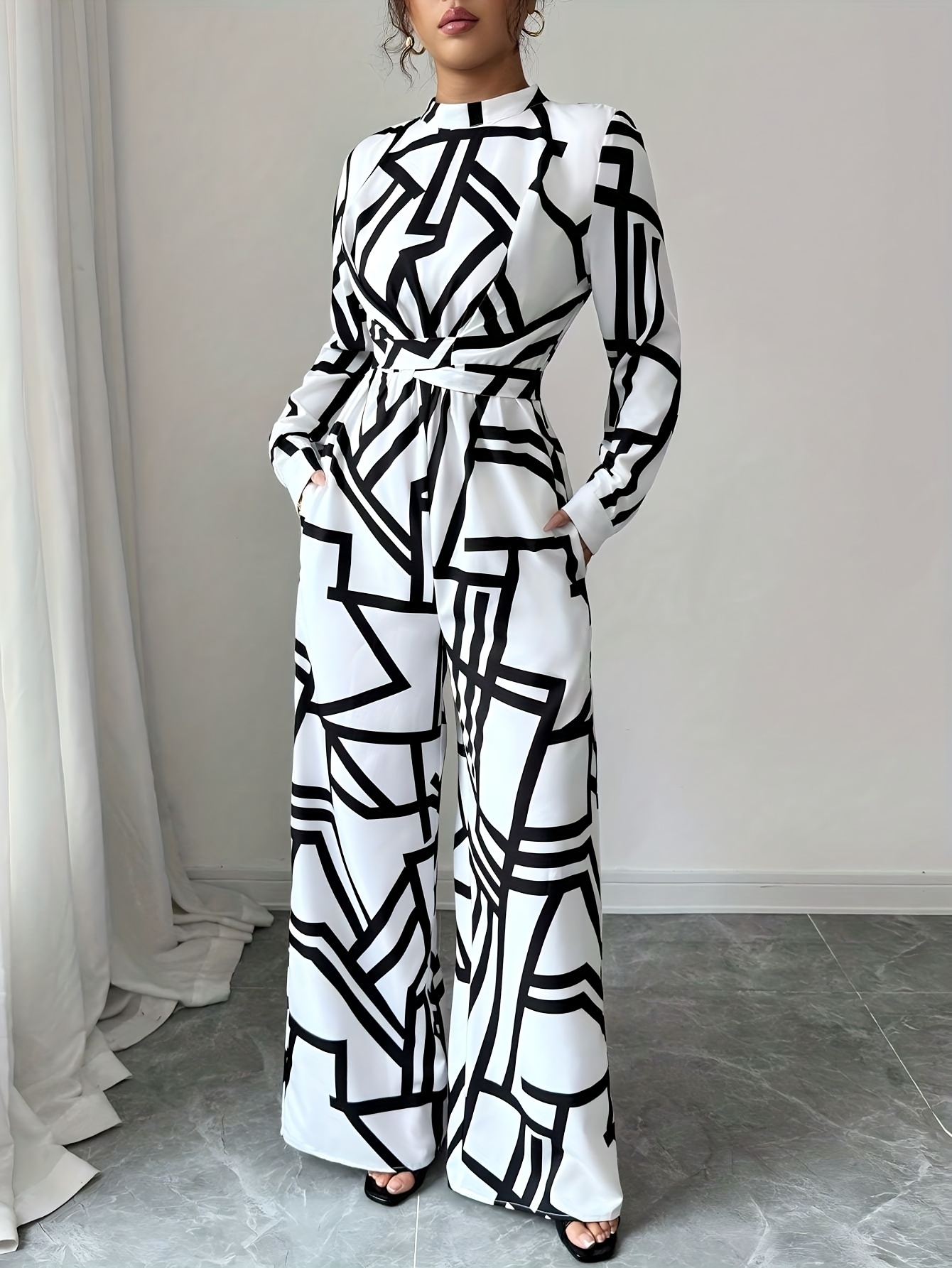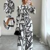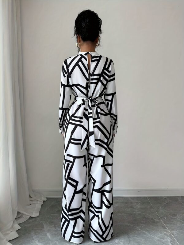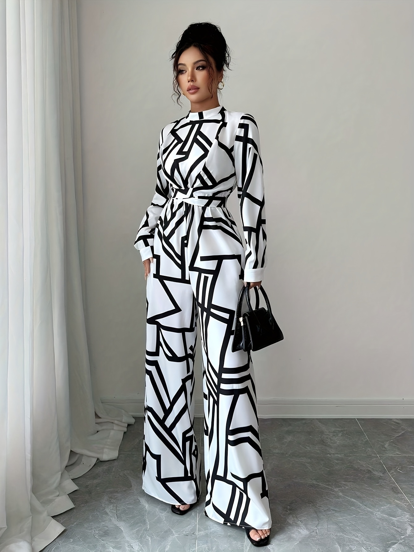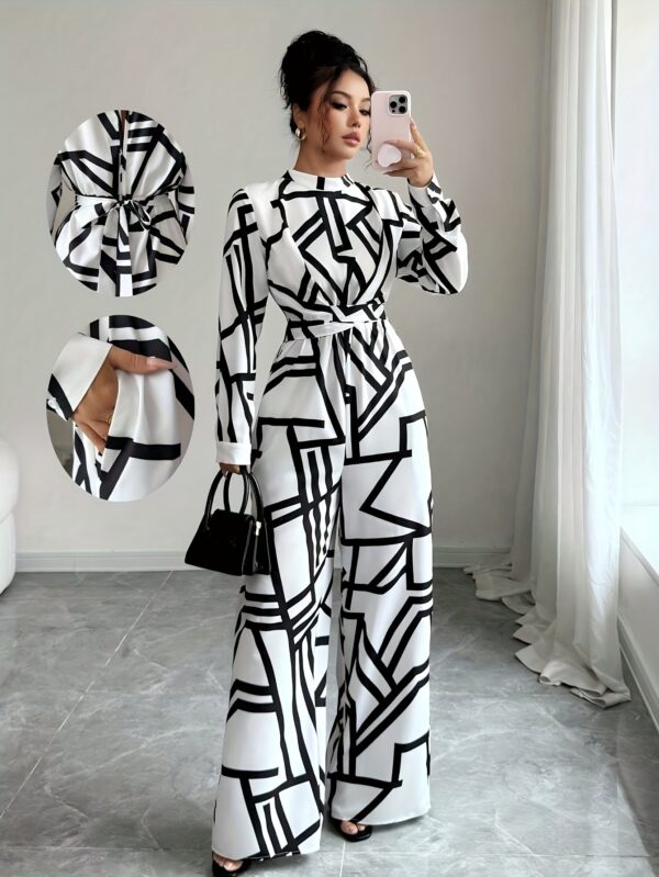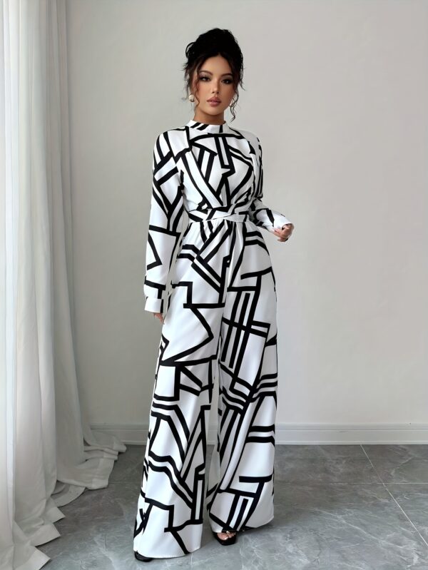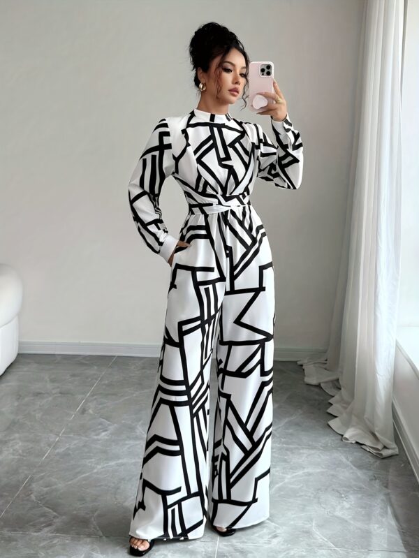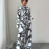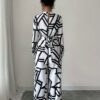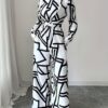 - تصميم هندسي فريد: يجمع هذا الجمبسوت ببراعة بين اللونين الأبيض والأسود ليخلق نقشًا هندسيًا عصريًا وملفتًا للنظر، مما يضمن لكِ إطلالة جذابة ومميزة تسرق الأنظار.
