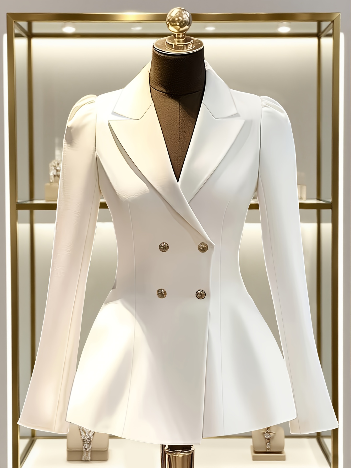 هذا البليزر الأبيض هو التعبير الأمثل عن الأناقة الكلاسيكية بلمسة عصرية، وهو إضافة مثالية لخزانة ملابس كل سيدة تبحث عن التميز والرقي في فصلي الربيع والخريف وما بعدهما.