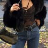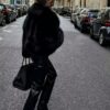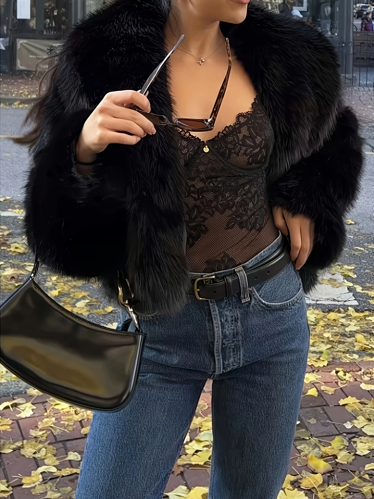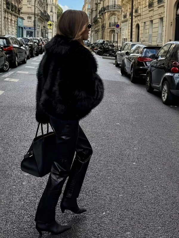 - الفرو الصناعي الفاخر والمتباين: استمتعي بملمس مخملي فائق النعومة يحاكي الفرو الطبيعي، مع تفاصيل متباينة تضفي عمقاً وتميزاً على إطلالتك، ليمنحكِ لمسة من الرقي والدفء الذي لا يُضاهى.