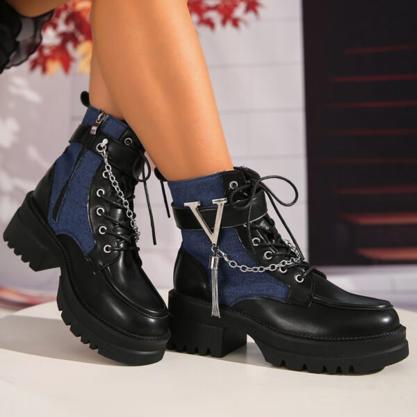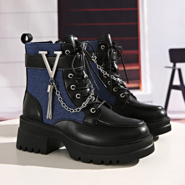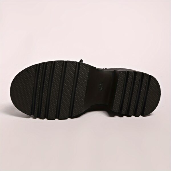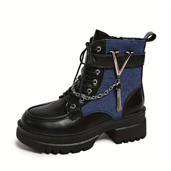 • تفاصيل بانك عصرية: يتميز بسلسلة معدنية جريئة على شكل V، وأربطة أنيقة، وسحاب جانبي عملي، كلها تفاصيل تضفي عليه طابعاً فريداً ومميزاً.